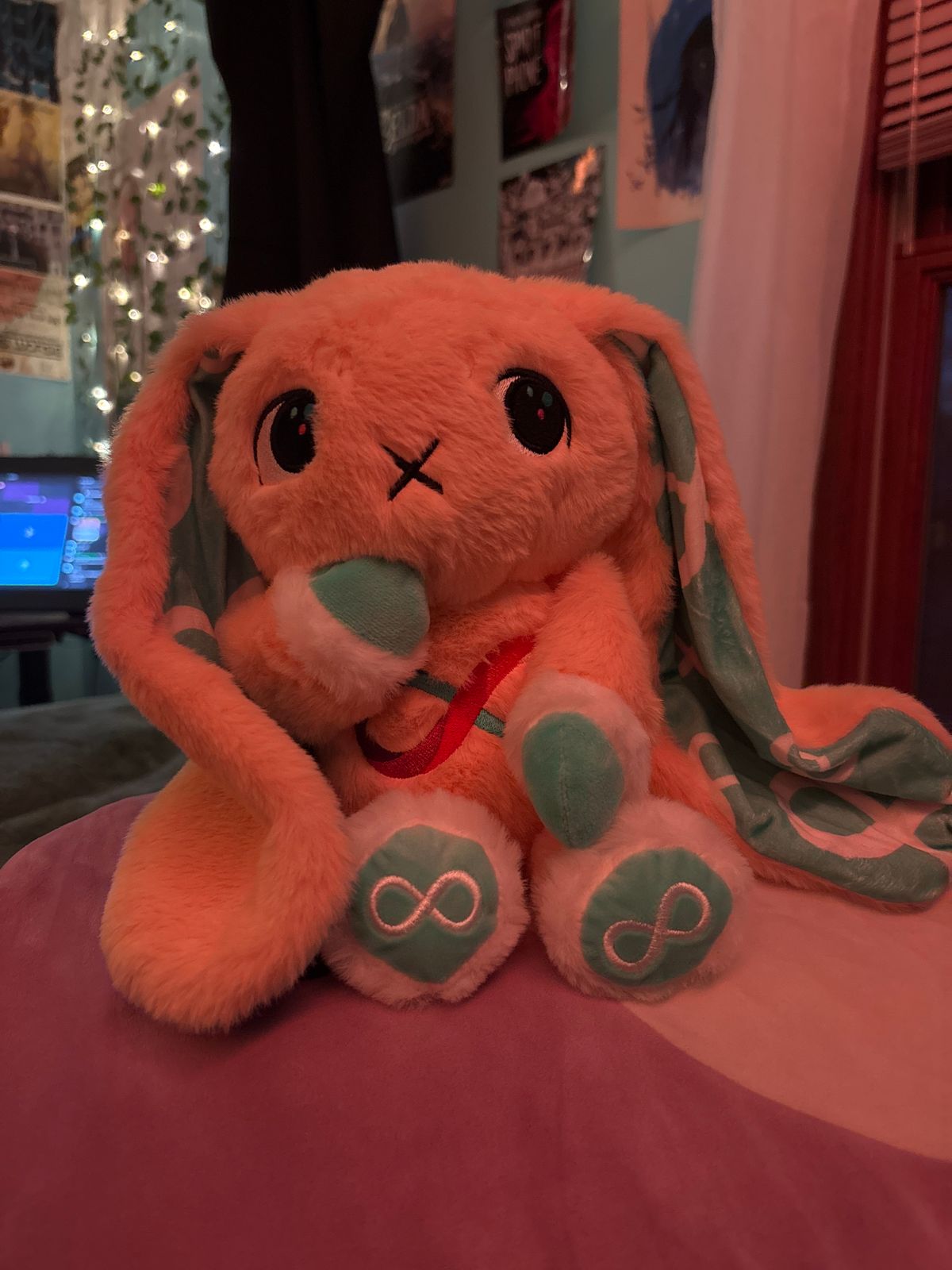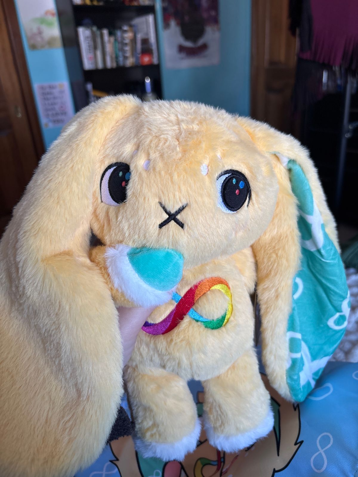 Some bunnies don’t whisper. They radiate. This is the Autism Spectrum Rabbit, and they shine in full spectrum. From the rainbow infinity symbol on their chest to the patterned teal that lines their ears and paws, this plushie doesn’t try to blend in. They are here to exist unapologetically and honestly, soft but strong, quiet but vibrant.