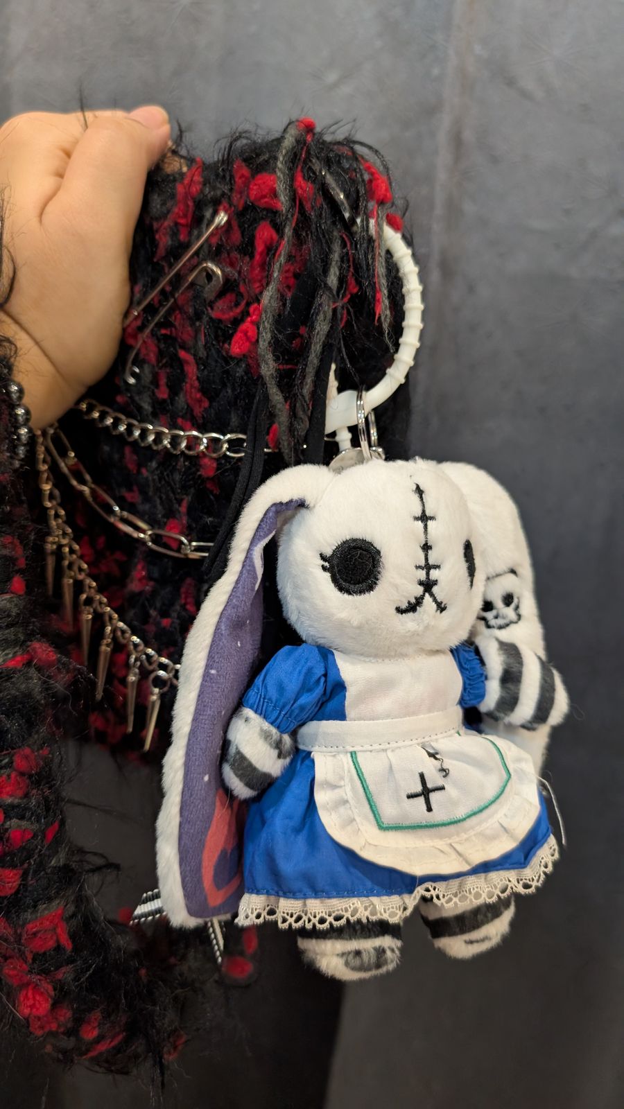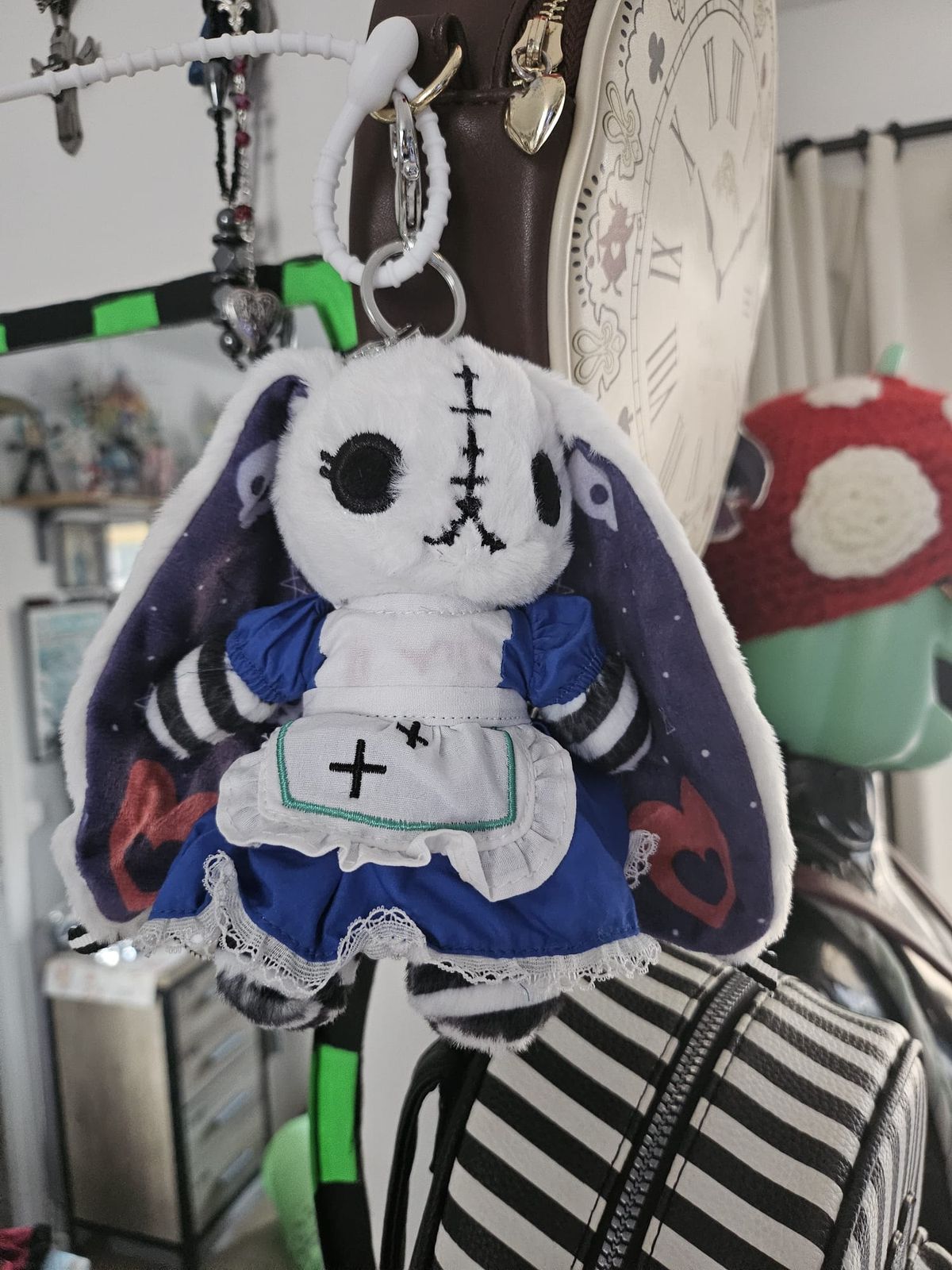 Meet the Mini Alice Bun, a pocket-sized sentinel stitched from memory and myth. With a blue frock that echoes a curious girl's journey and a skull-lined ear-lining that whispers of quiet rebellion, she is not merely a keychain. She is a memento imaginari - a reminder that within every dull corridor and crowded commute lies a door to otherness.