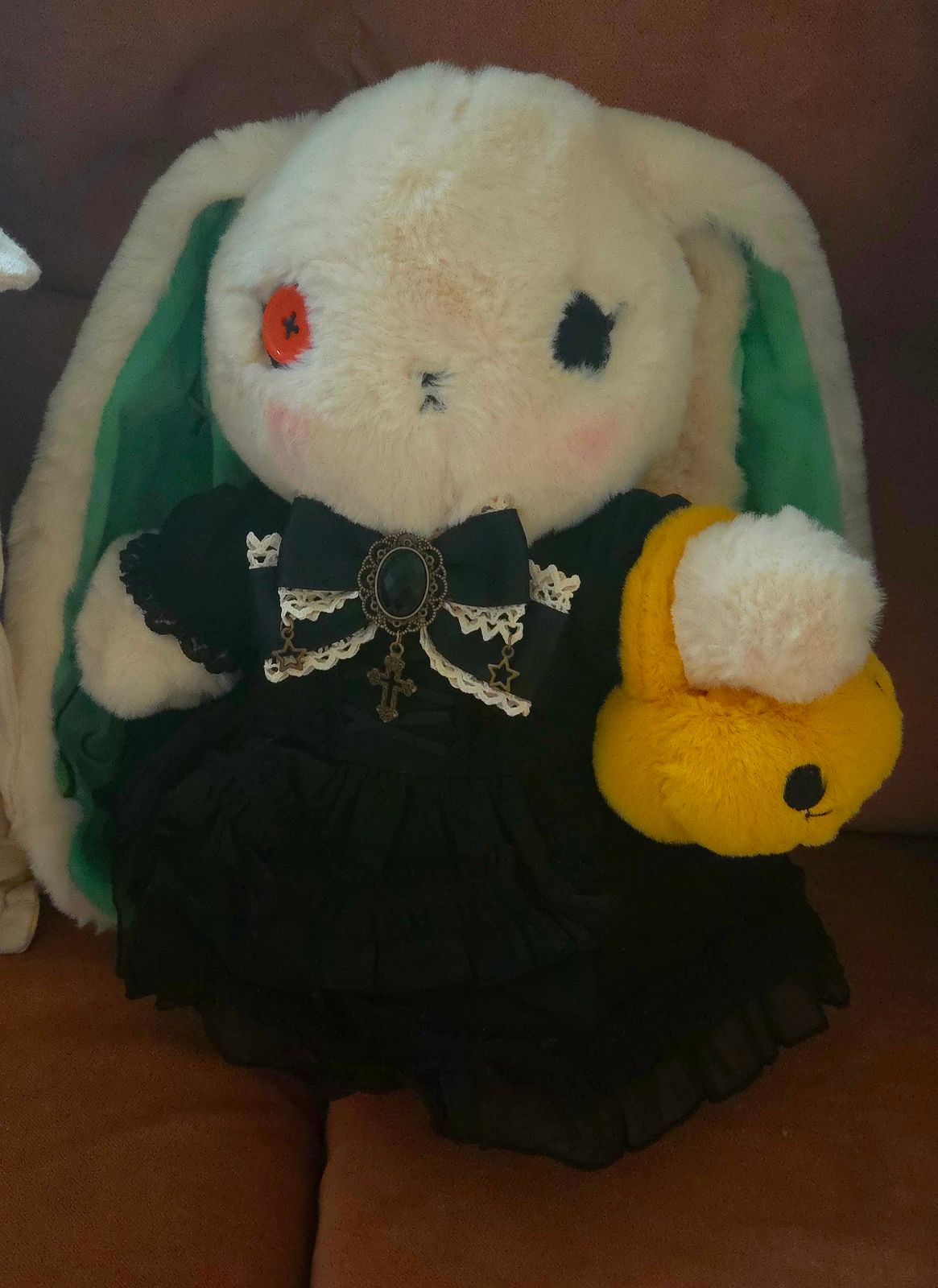 In a land stitched together by shadows and silk, there dwelled a rabbit unlike any other. Her name was Cinderella, but her story did not sparkle with glass slippers or midnight balls. Instead, she wore a dress spun from gothic lace and secrets, with a tiny pumpkin basket clutched in her paw to carry the wishes no one else dared speak. Her eyes, mismatched like forgotten buttons, have seen both wonder and woe. Lined in emerald green, her long ears whisper tales of lost time and softly muttered spells.