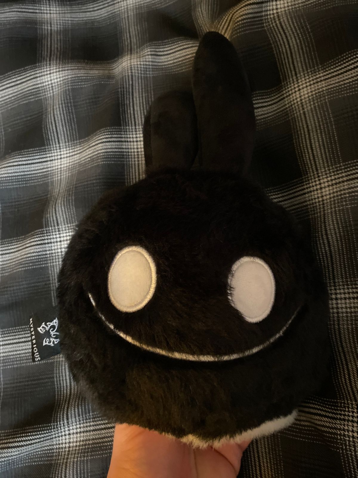 Bipolar Bunny is a reversible bunny fluff. You flip it between a Black Smiley and White Frowny by turning it inside out. The bag it comes with is also reversible - with a smiley and frowny side.
