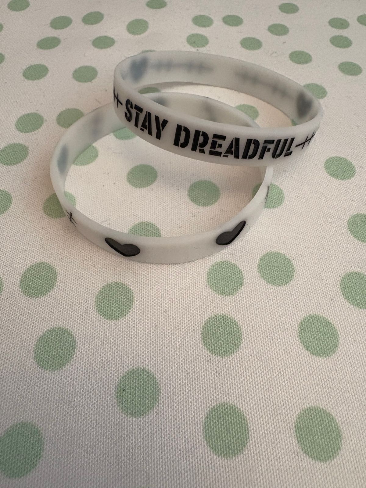 One band is printed with the signature “STAY DREADFUL” motto and plush stitch details, while the other features a stitched accent and a bold little heart that glows with attitude.