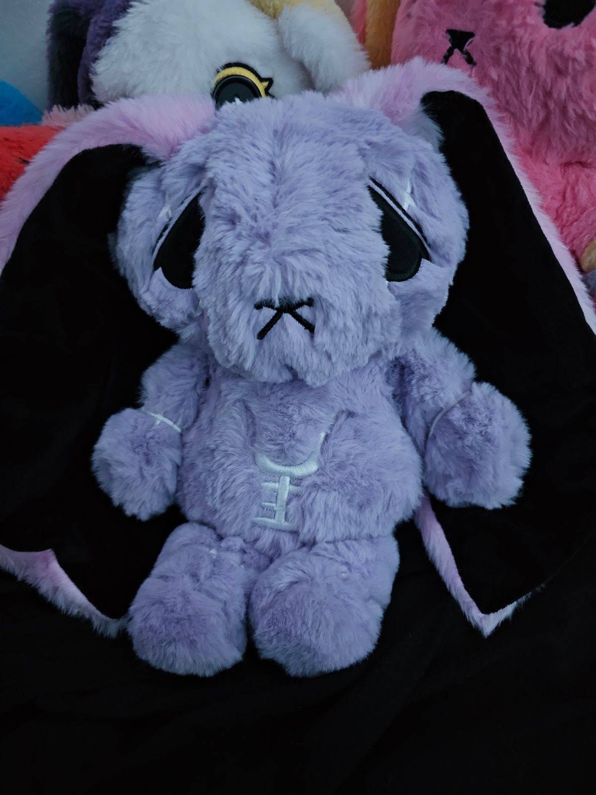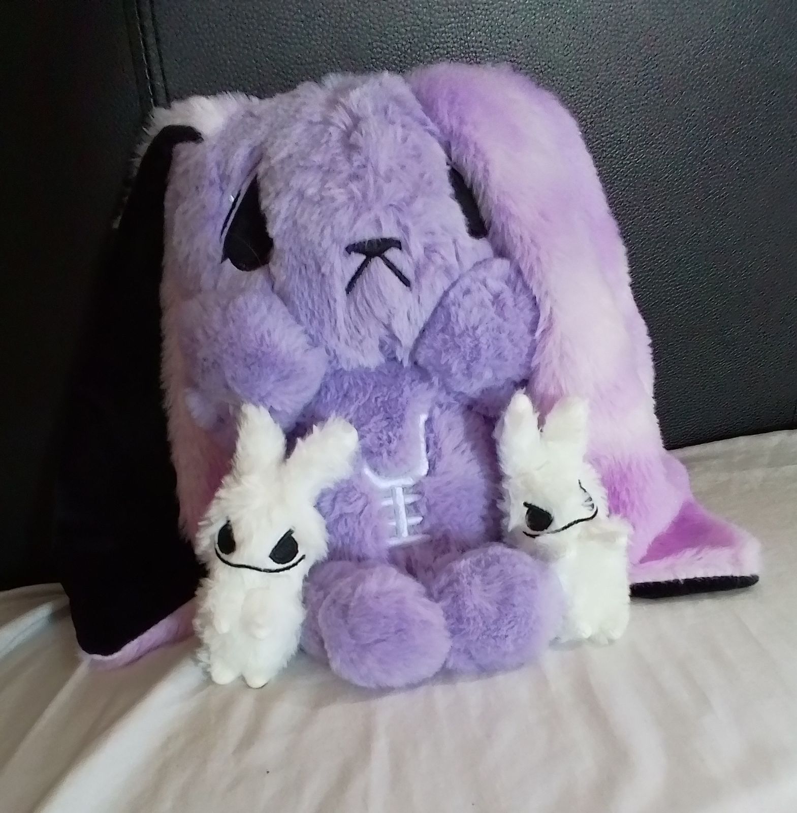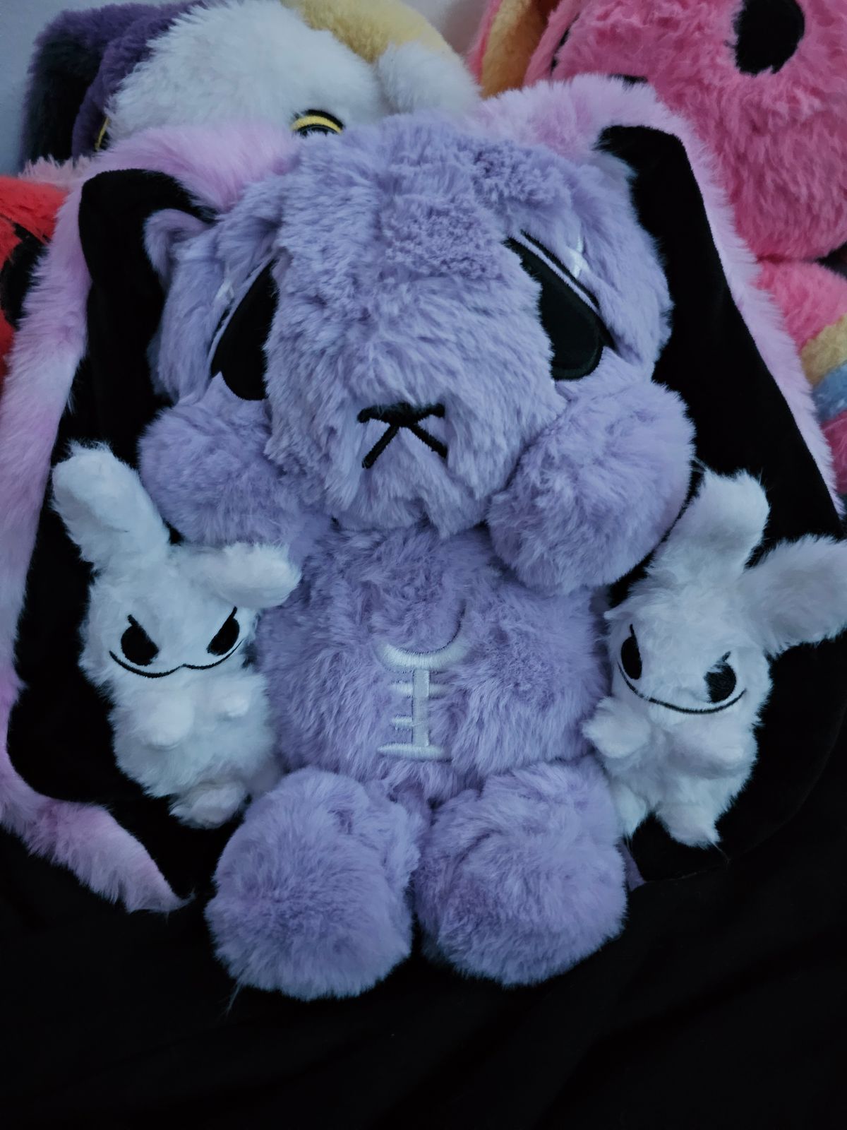 This collector set includes two teal Mini Buns who act as portable anxiety vacuum cleaners. Whisper your anxious thoughts to them, zip them into the Anxiety Rabbit’s back, and place the whole squad under your bed or in your preferred crypt. Legend says it will transfer all bad vibes to internet strangers who overanalyze your tone in the comments. We’re not saying it’s magic. But we are saying their skin might tingle purple for a month. Voodoo is bad. But this? This is just plush-based emotional redistribution.