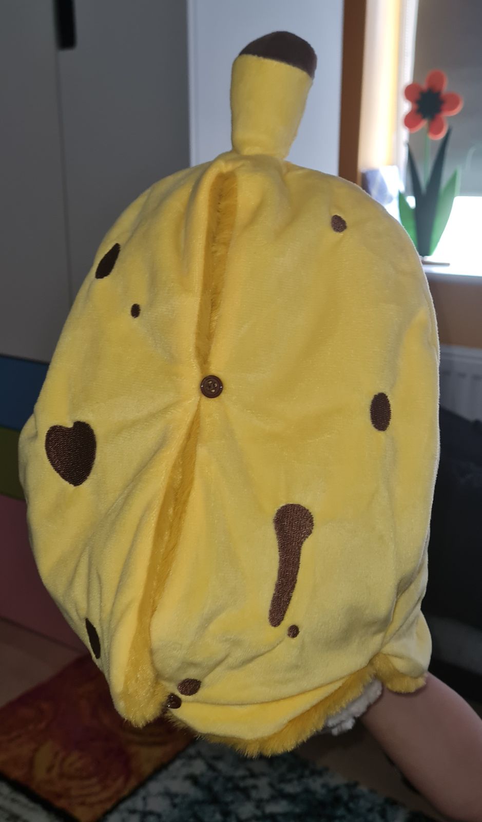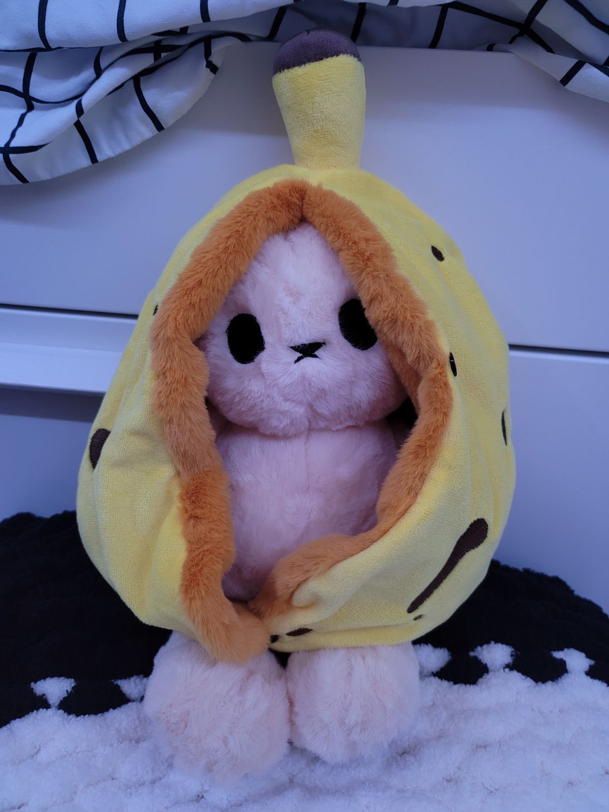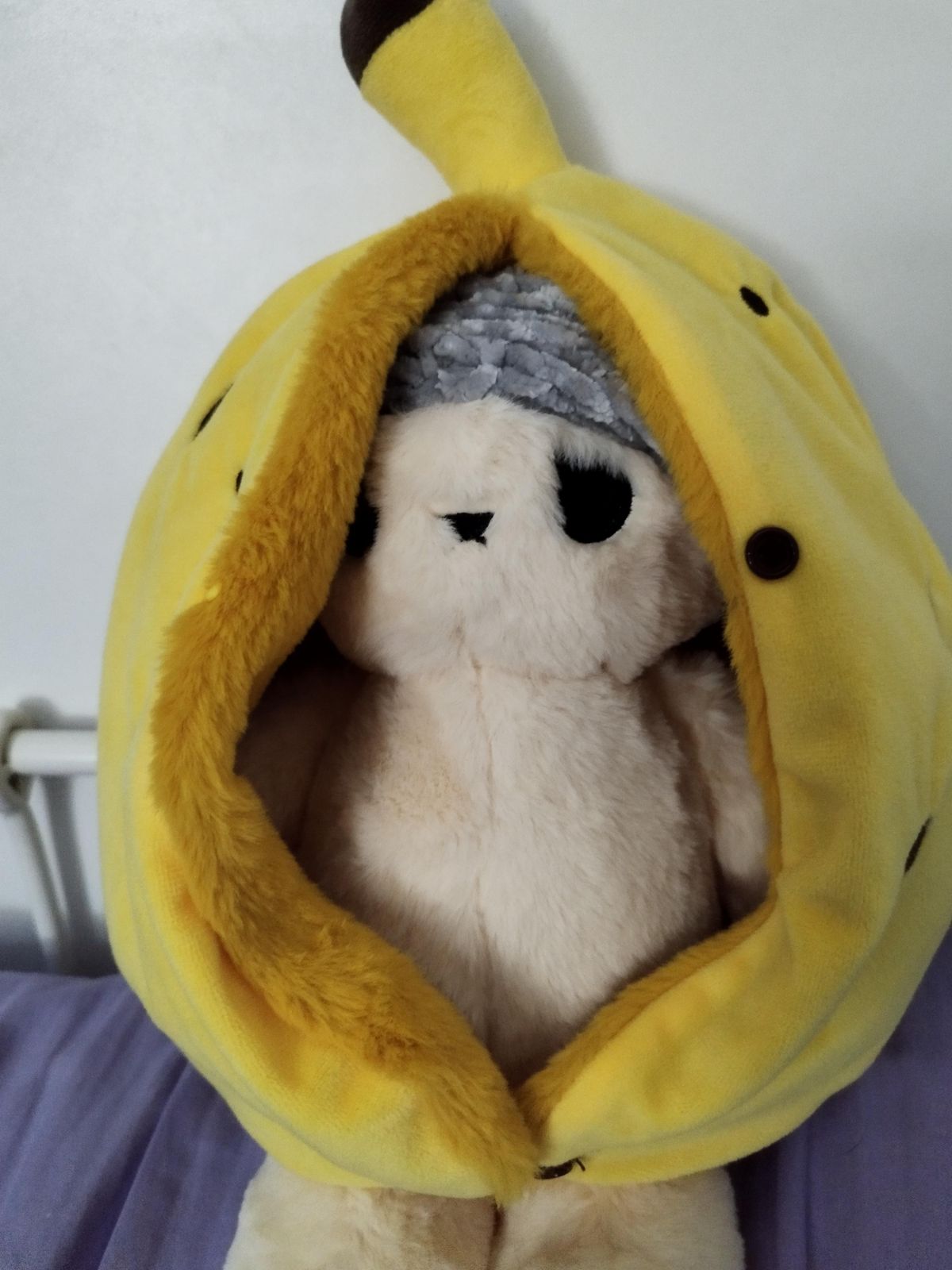 What the flip he's so cute I love him so much he looks really stupid without the peel which makes me giggle I love his stupid circle banana head — umm ok I think he's a bit camera shy he just closed his peel and ran off in the middle of the shoot but I guess you can't really see much through a banana peel because he ran into the wall and is just laying there... bro said gotta make like a banana and split but anyways thanks for reading guys unfortunately it's time for me to go he's not convinced that the cameras are off