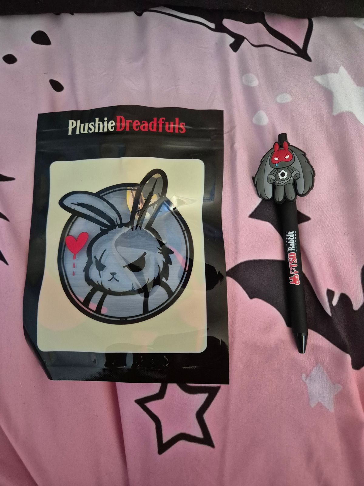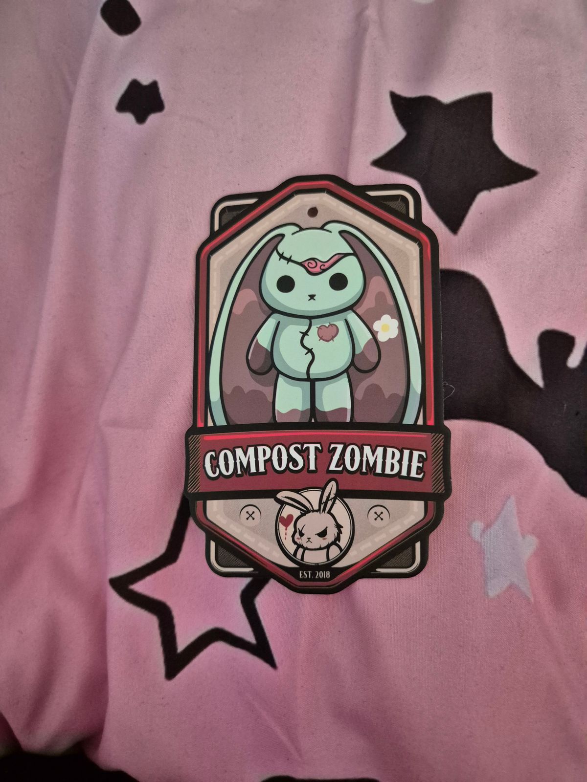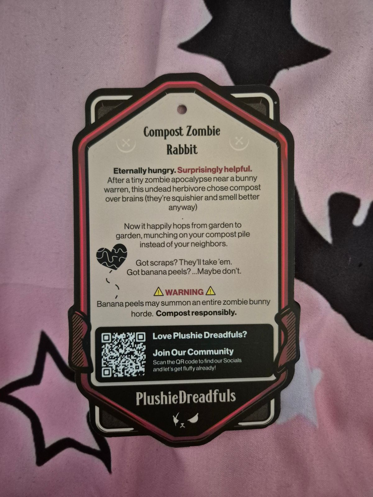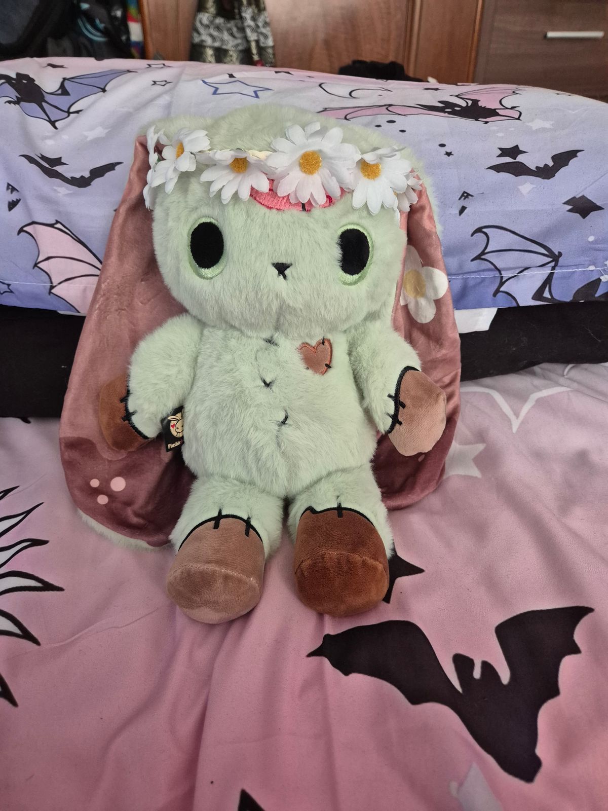 I had no idea a zombun could be so cute until aI met this little girl. The embroidered details and brain are to die for, and her daisy crown covers all that up nicely for when we want to be a little snazzy and hide that visable brain. Like the Cheshire cat, I didn't realize right away that she, too has the same scar down her belly that I have. And I feel she's my spirit bunny for that reason alone. I know it seems silly, but having representation doesn't make me hate it was much as I have for the last 5.5 years, and for that im happy.