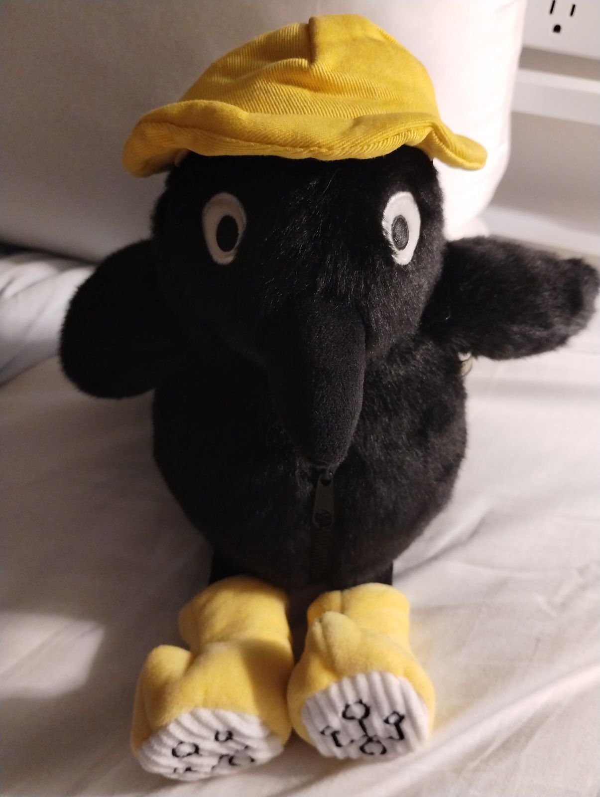 He is just perfect! Such a friend-shaped boy, and SO soft! I love the way his legs dangle, and how his wings and tail are just right to stroke. His head and beak are also most kissable. His booties and hat stay on just great (thanks to an elastic chin strap on the hat and small velcro tabs on the back of each boot) but he looks equally adorable with or without his outfit. His treasures are also incredibly lovely and fit neatly into his little pocket. The coin is a real coin! And the lovely plush cigarette butt is the only acceptable butt for my new crow buddy to get his claws on. I love the awareness-raising with this plush. Dispose of those butts safely and be a friend to the birds! Remember: crows hold grudges.... 100% recommend Crowful Crow, he is the best.