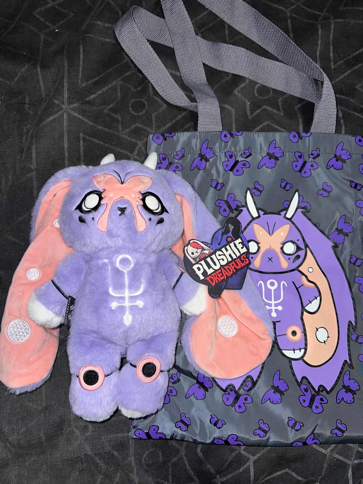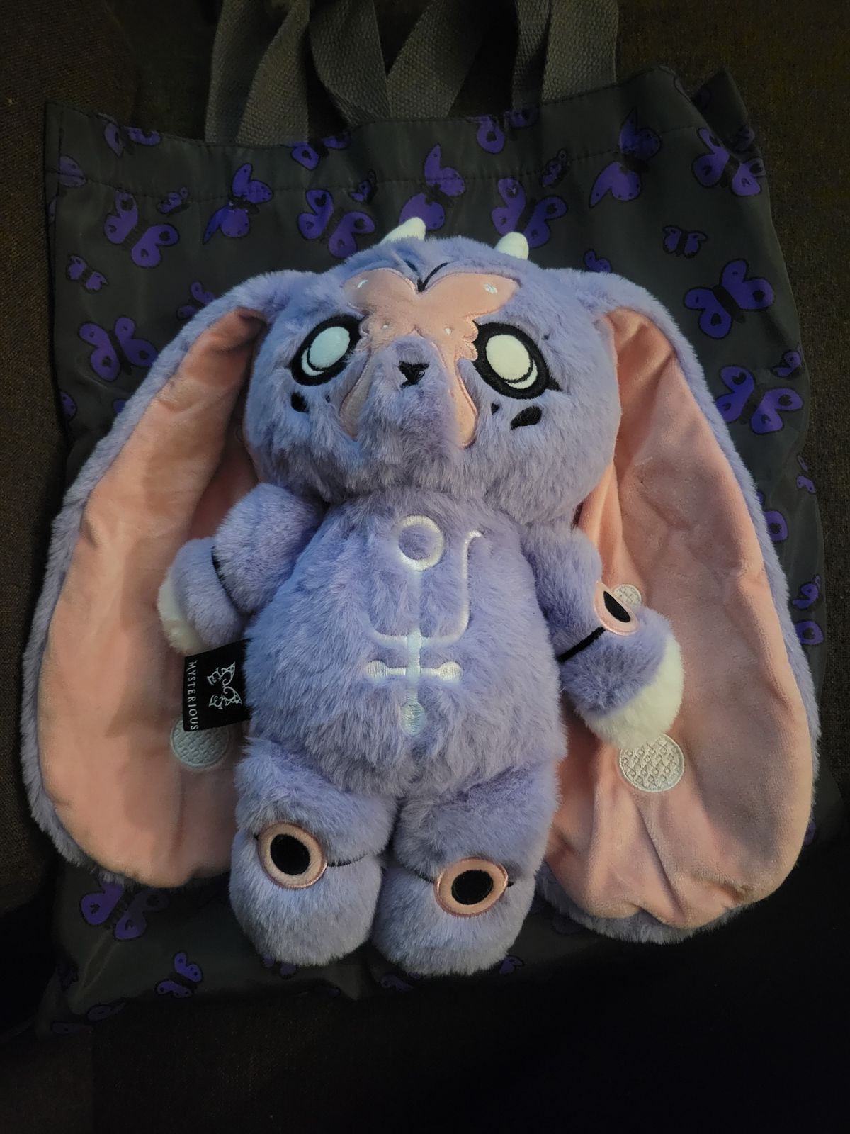 We hope you'll like this lovely lavender rabbit with the butterfly symbol on the face, and "Antimony" (also known as Wolf) Alchemy symbol on the chest.