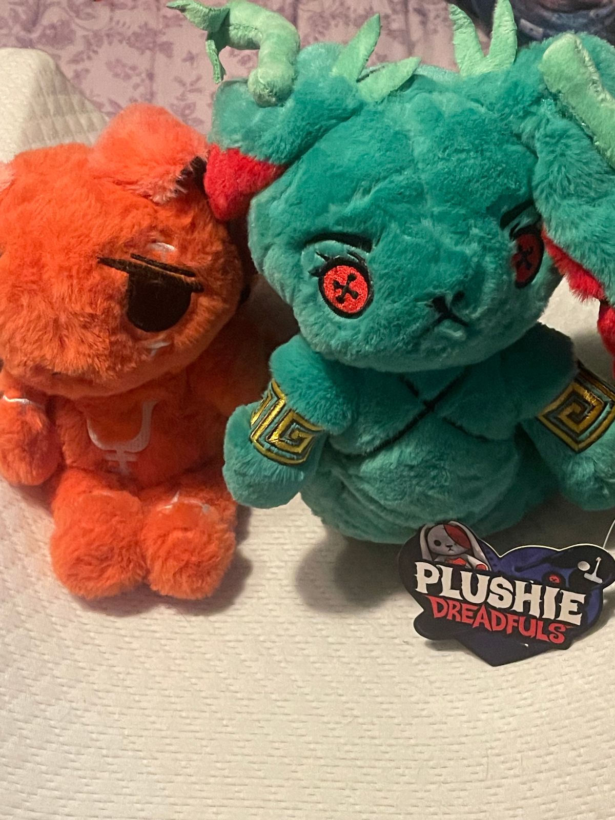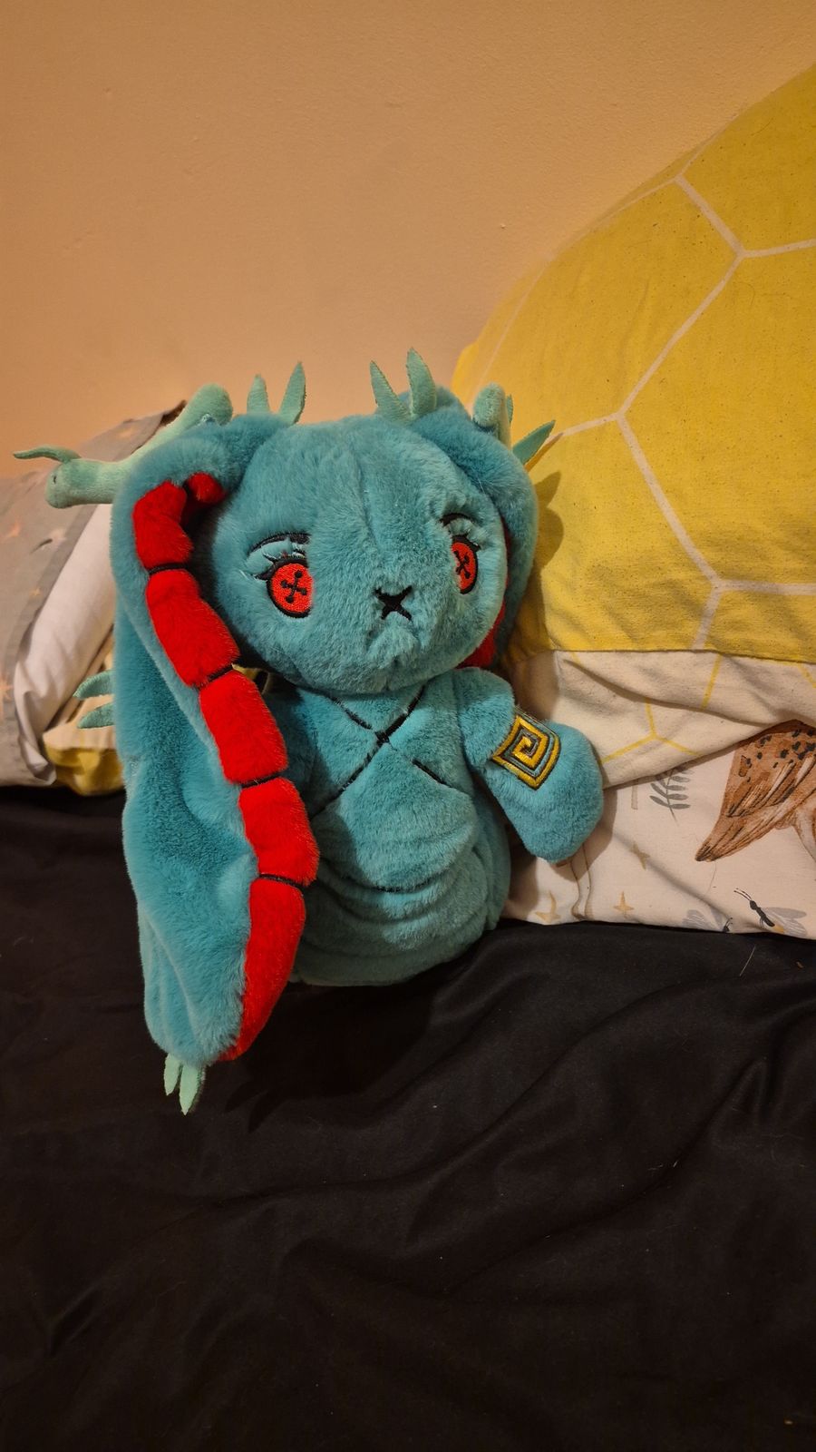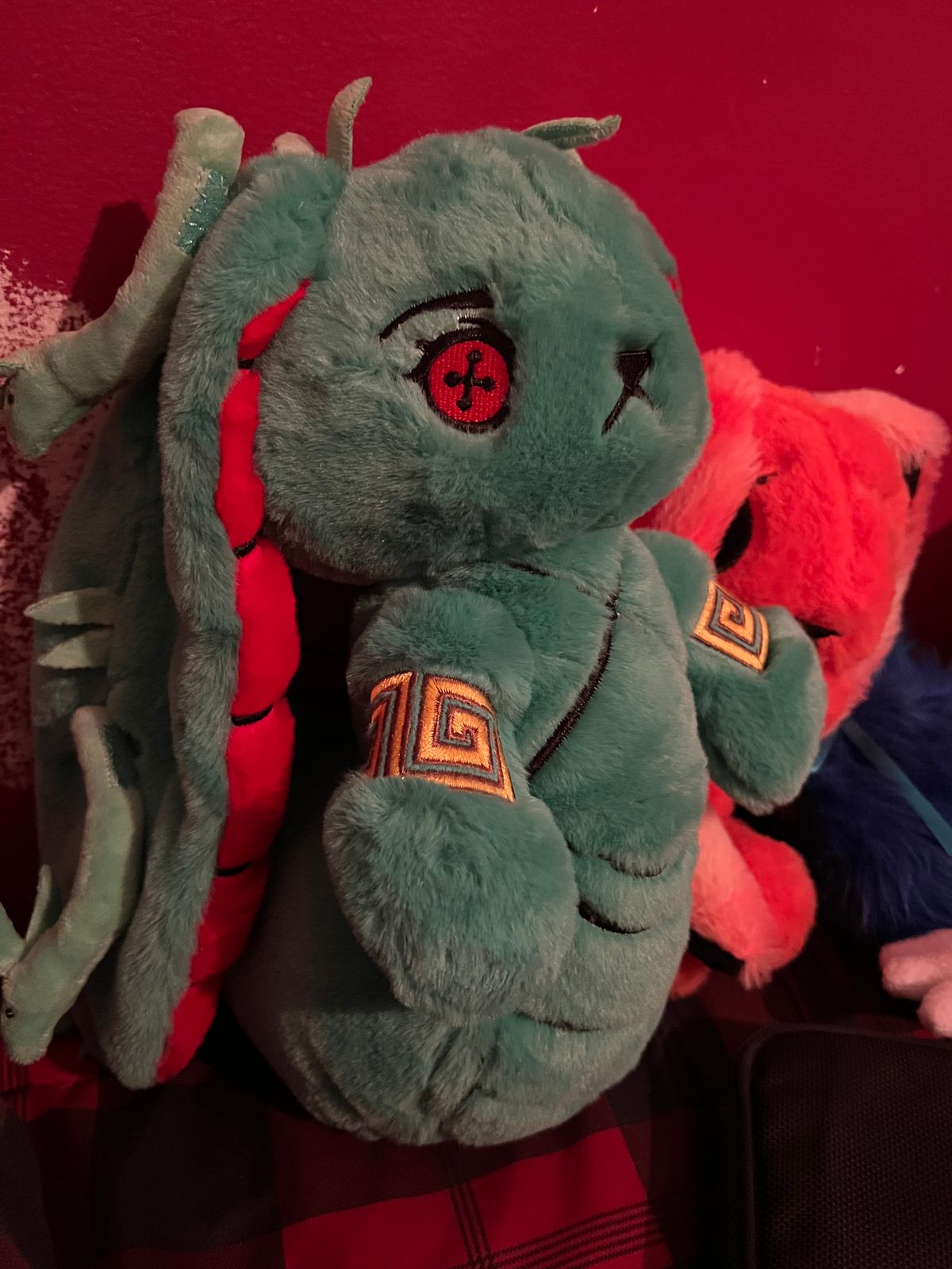 I received her in two weeks and she was packaged securely and when I took her out she was in perfect condition (as all of my purchases have been so far, thank you Mysterious). She was much bigger than I expected which is a pleasant surprise. She looks just like the picture, a lovely mix of red, green, and gold. The little snakes on her ears and such are all removable which I think is pretty cool. They also have little rabbit ears which makes them so cute! I love the attention to detail with the golden cuffs on each of her wrists (it kinda looks like they’re squeezing her wrists a bit tight which is pretty realistic). She’s also unique in the sense that not only is she my biggest bunny so far but she also has no legs, only a serpent’s body. She can sort of stand but it’s easier if you let her lean on something. I love her and she is definitely one of my most favorite apart from my Anxiety Rabbit, Gender Dysphoria Rabbbit, and my Pride Rabbit. A very beautifully designed bunny and you can tell the creators really put time, care, and love into this! Thank you Mysterious and I will be buying more from you all in the near future!