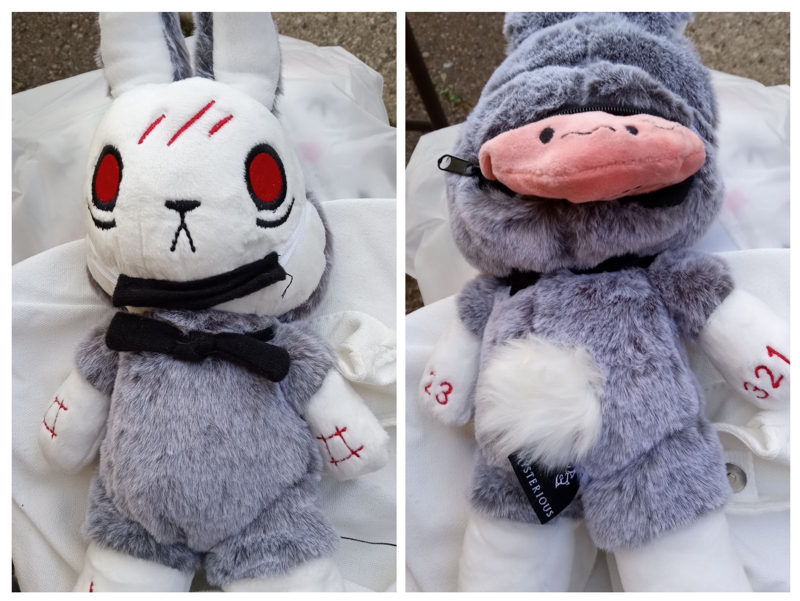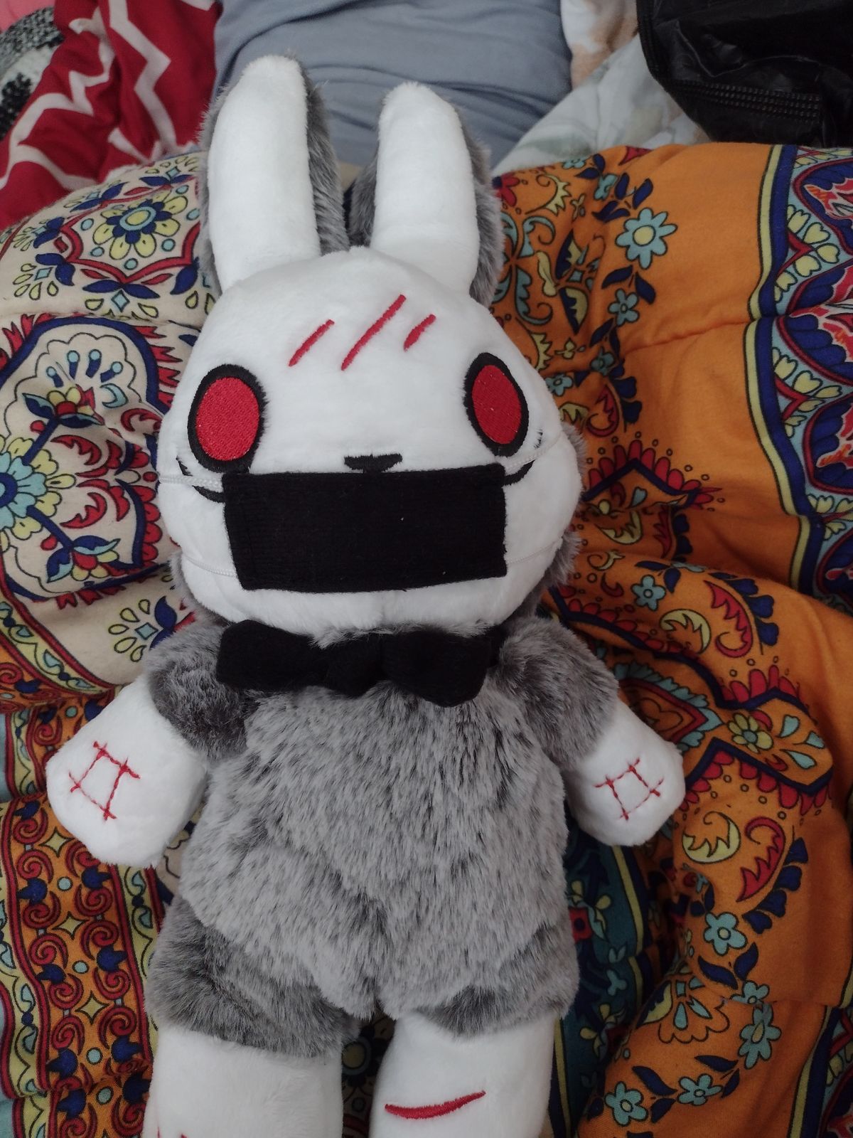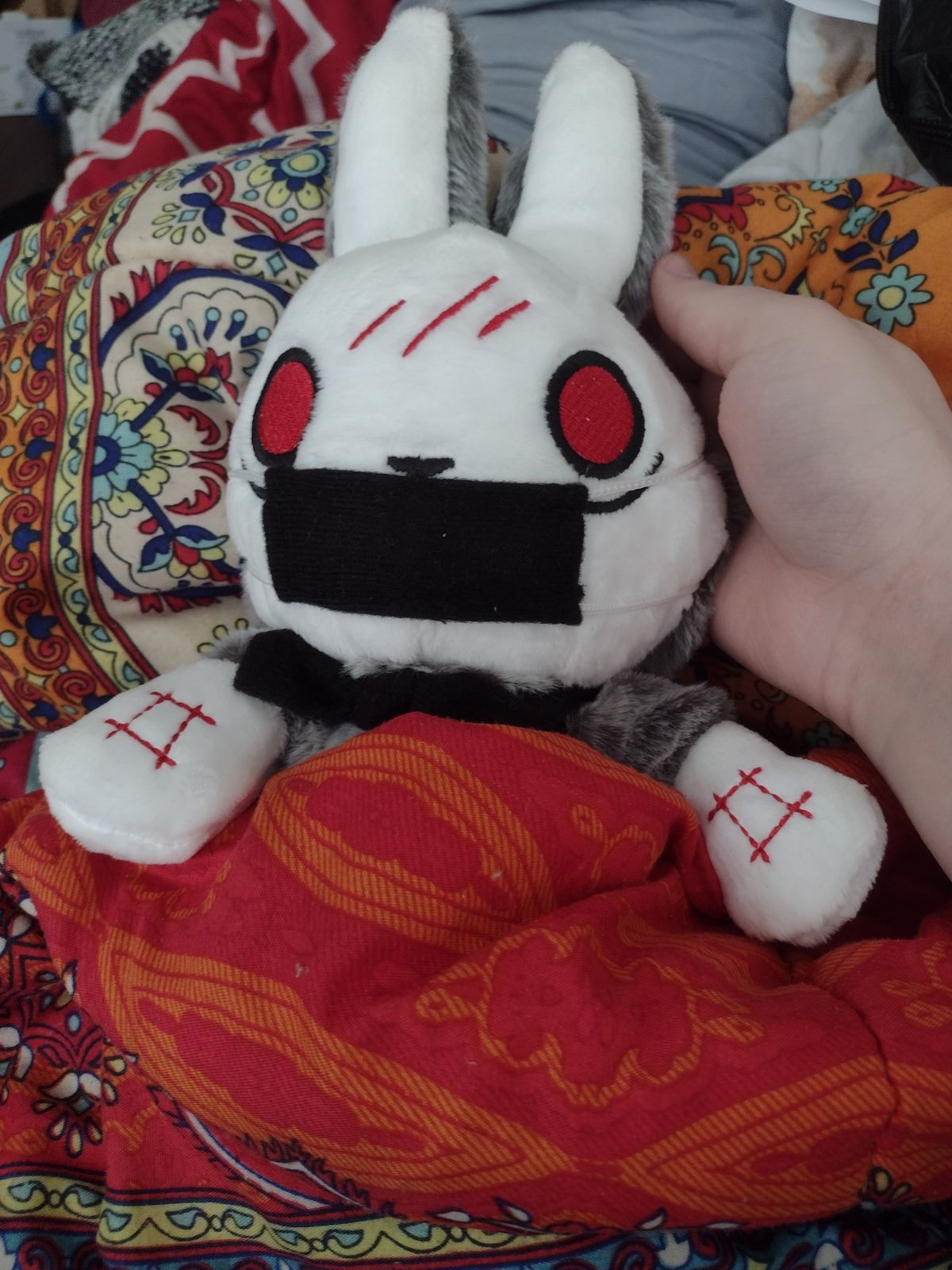 I'll start with the negative. Ironically enough, the OCD bunny is setting off my OCD. Mysterious claims all their plushies are hand made and that there will be variations between them, which of course in my mind lets me give some leeway, but the problems are definitely there. Limbs and ears aren't equally stuffed, there's a single red stitch on the wrong side of one of the embroidered cuts, material near the neck is bunched up a little... it's all very small things that add up. The worst for me personally is that he shipped with his mask on... which has left some rather slight, yet assumedly permanent indent marks across his face. And following that thread... what's with the shipping times? I had assumed these would be shipped from the US, being hand made and all, but instead they come from China and take weeks to arrive... the cynical part of me wants to say that in reality, these are possibly mass-produced in Chinese factories, and any claims of being hand produced are only to handwave quality issues and mark up their price tag. I don't feel like they'd outright lie about their manufacturing process, but being made in China does inevitably bring about several human ethics questions, especially with such an outwardly pro-diversity company. I could be wrong; I hope I am really, and I apologize if so. I just don't know enough to know for sure.