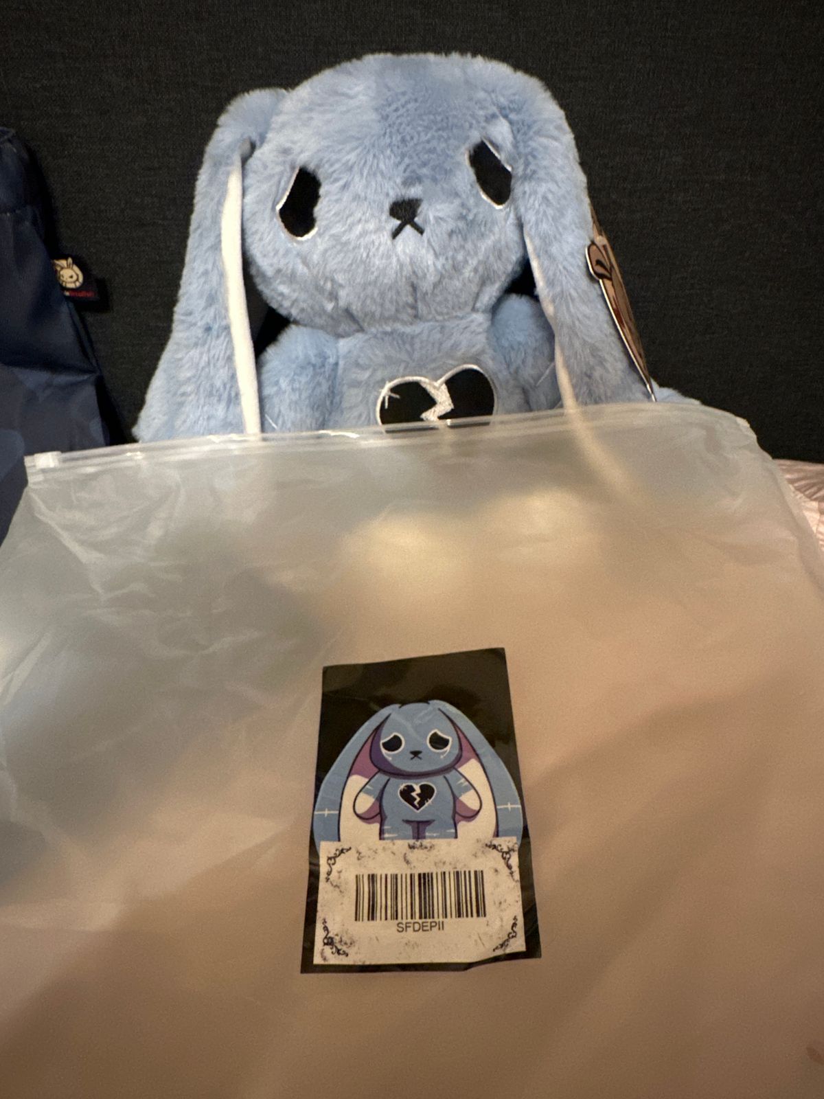 she was extremely securely packed. the package was plushie dreadfuls themed and even the tape keeping it closed was adorable. inside was another sealed bag with the tote bag, plush, and a PTSD rabbit-themed pen freebie inside.