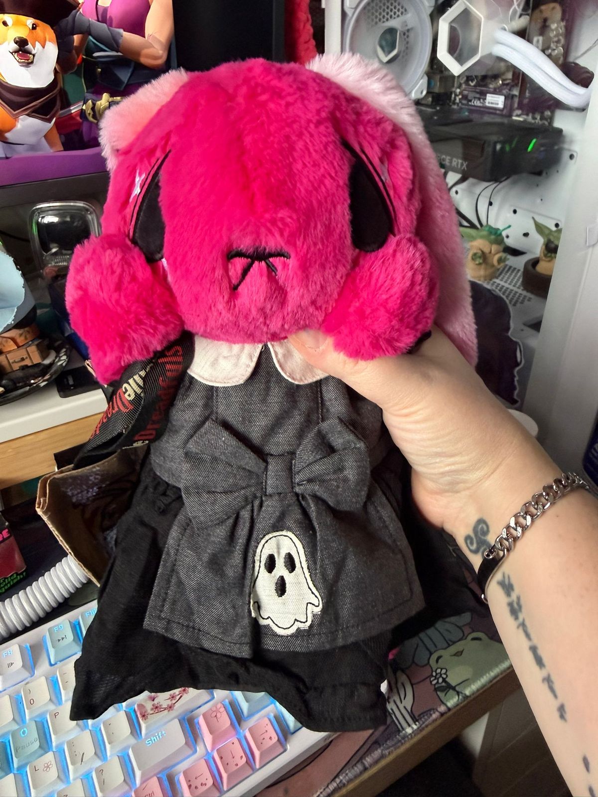 当店のフルサイズのウサギのぬいぐるみのほとんどにフィットするこの不気味なアンサンブルは、専用のPlushie Dreadfulsロゴ入りショッピングバッグに入っています。幽霊の冒険のお供にぴったりです。鏡の迷路で秘密を追いかけたり、ずっと行方不明だったワンダーランドの魂の物語に耳を傾けたり。あなたのぬいぐるみは、生者とまだ死にかけの者が出会う世界へと、優雅に装いを添えてくれるでしょう。