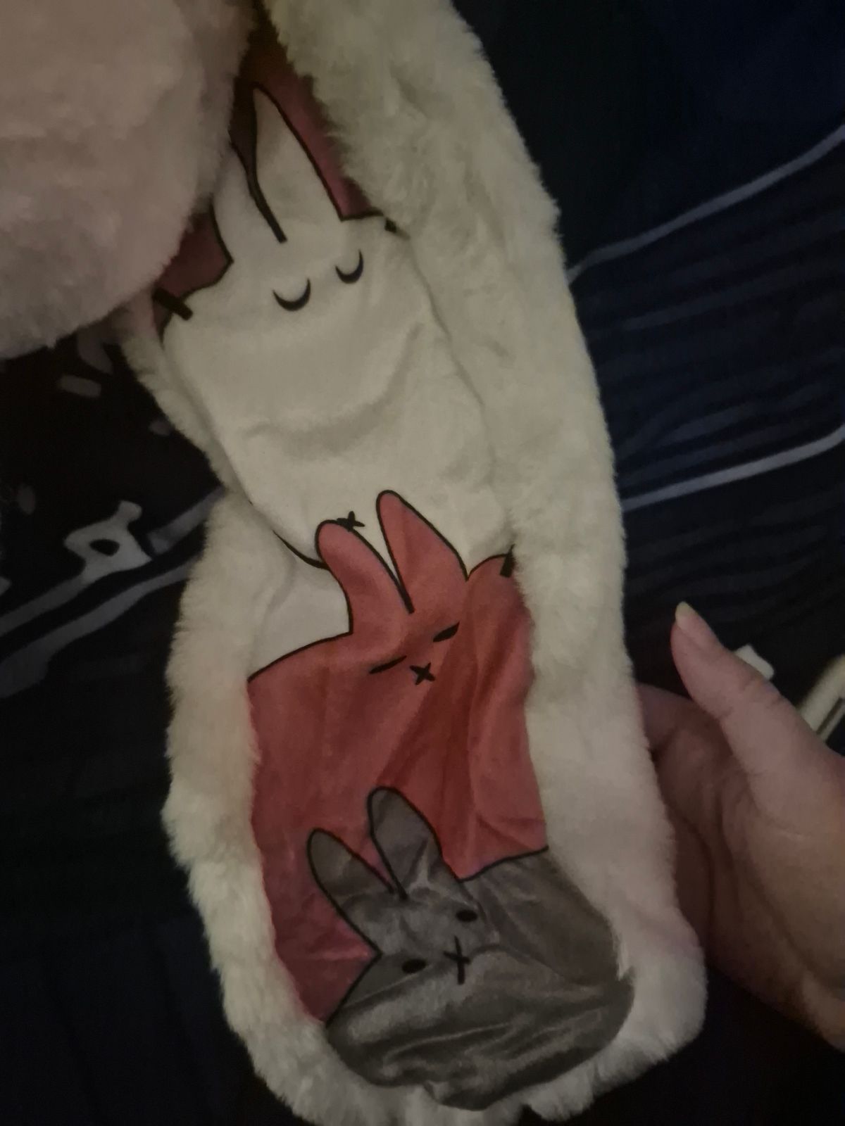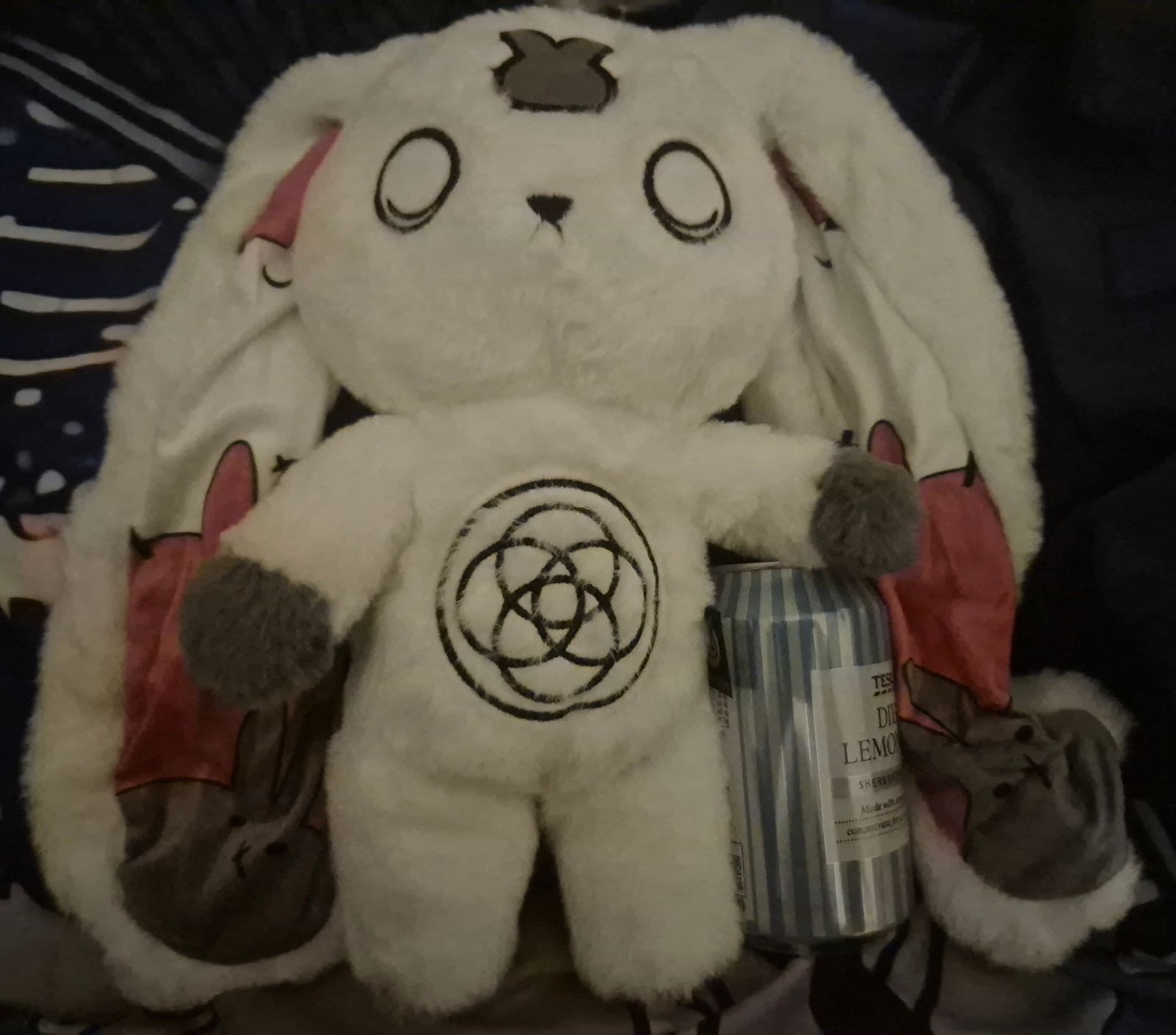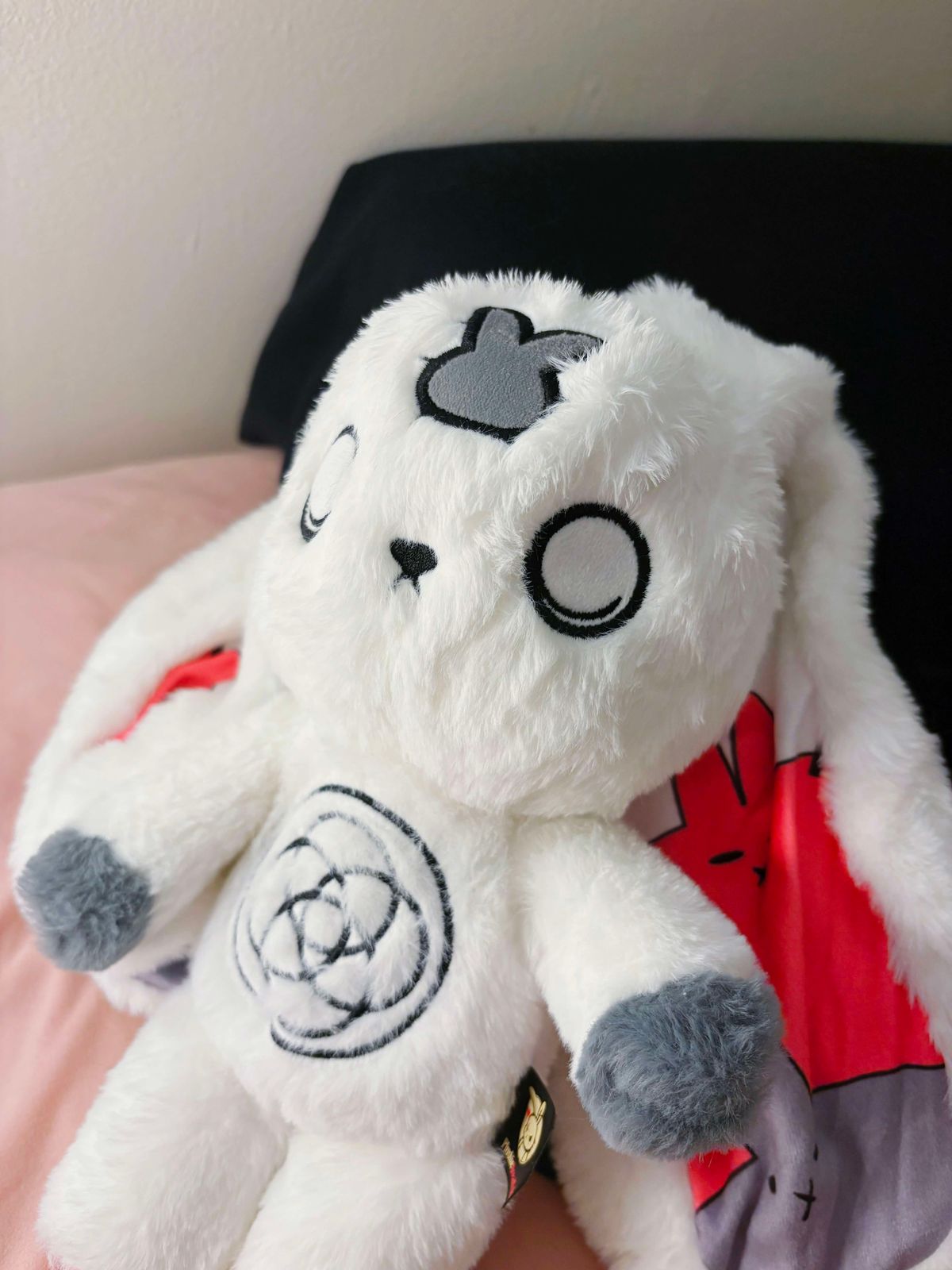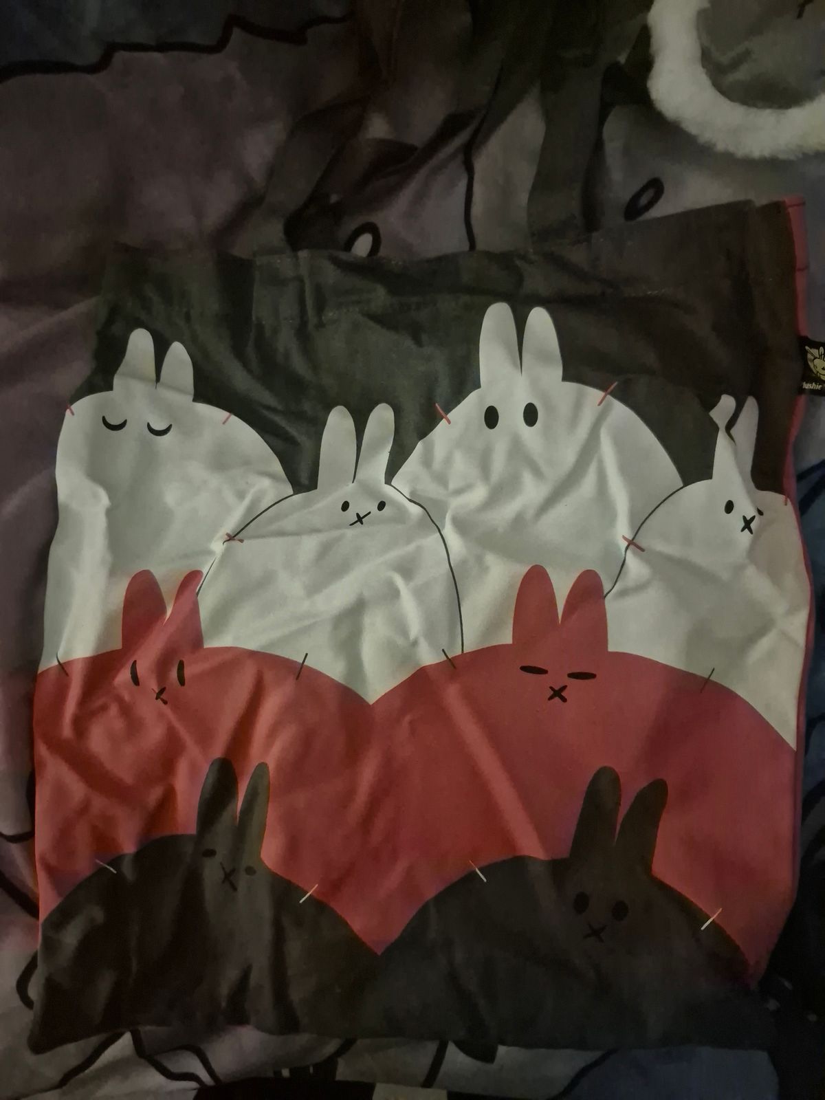 I love them so much, I have DID and I only found out about it 3 years ago now since I'm almost 19. The ears are so long and lucious, the stare is something I do a lot, the bunnies in the ears! I love this guy so much. I feel so comforted by this and the tote is such a cute touch! I am also polyfragmented and have been fake claimed a lot for having so many alters due to people that fake it and say they have a lot. This plush makes me feel seen and I nearly cried when I got it.