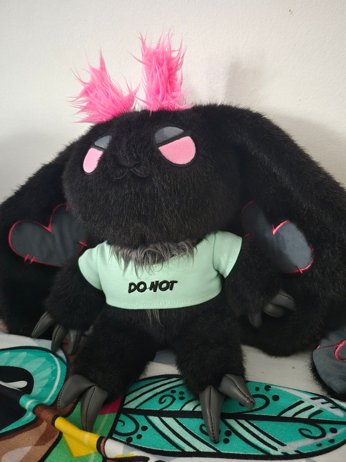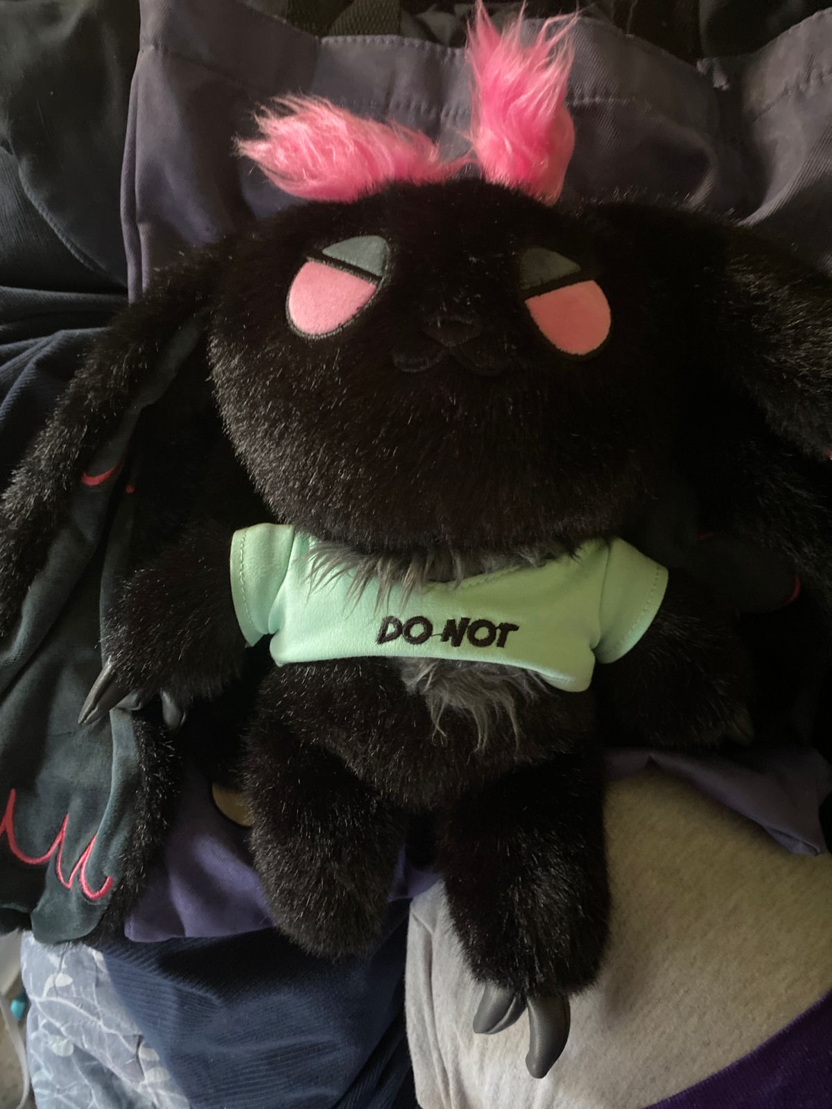 伝説によると、彼女はひびの入ったコンパクトミラーに映った姿で初めて現れたという。あまりにも多くのものを見すぎて、あまりにも辛く感じていた者たちのささやきによって、彼女は現れたのだ。燃え尽き症候群よりも黒い毛皮をまとい、マゼンタ色の反抗的なふさふさした触角を冠した彼女は、短い丈の警告マークを身につけている。 「絶対にだめ」と。彼女は言葉を発しないが、すべてを語る。もしあなたが元カレにメッセージを送るのを物理的に止めてくれる誰かを必要としていたなら、彼女はここにいる。彼女は既にここにいる。