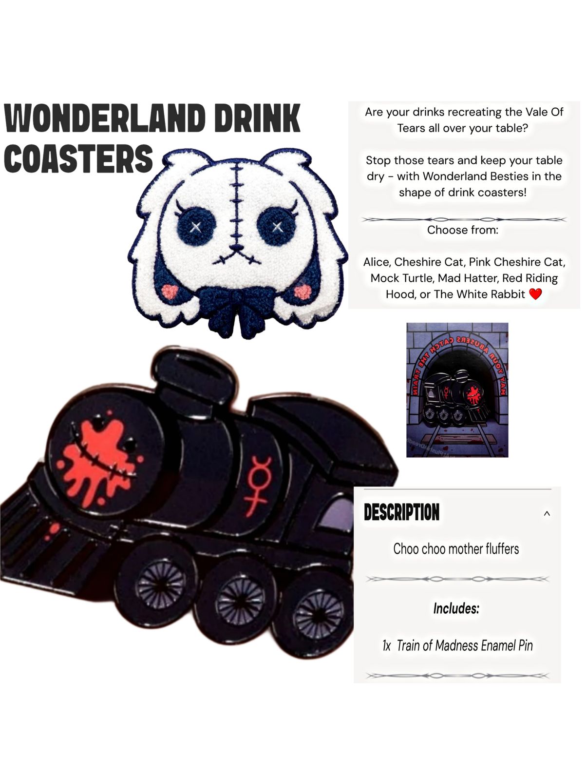 Plushie Dreadfuls Wonderland ドリンクコースターはMysterious LLCの著作権であり、plushiedreadfuls.comでのみご購入いただけます。Plushie DreadfulsはMysterious LLCの商標です。