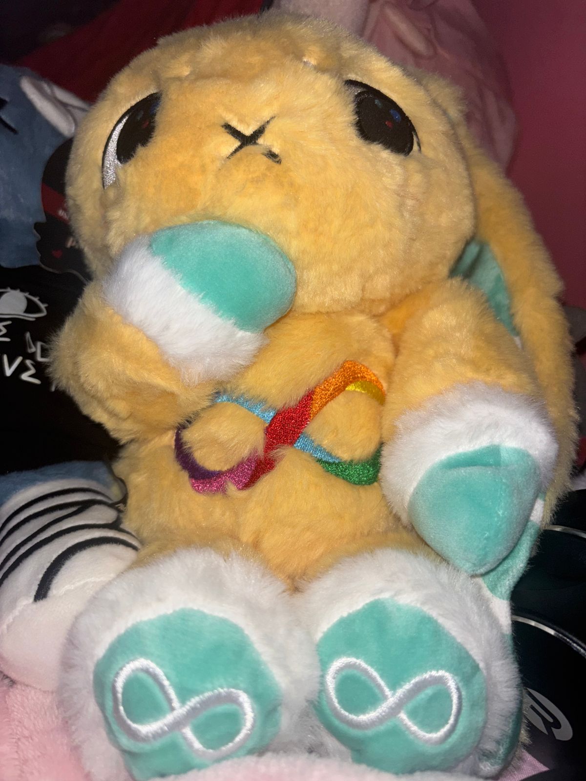 Some bunnies don’t whisper. They radiate. This is the Autism Spectrum Rabbit, and they shine in full spectrum. From the rainbow infinity symbol on their chest to the patterned teal that lines their ears and paws, this plushie doesn’t try to blend in. They are here to exist unapologetically and honestly, soft but strong, quiet but vibrant.