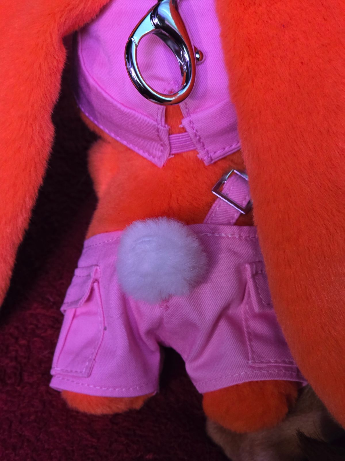 Is my purse companion the coolest looking bunny EVER? You bet she is! And the quality is excellent. I did open up a little kind of buttonhole for my Bunny's fluffy tail to fit through, giving it some hand stitches around for durability, but otherwise, this was a perfect outfit. Live it!