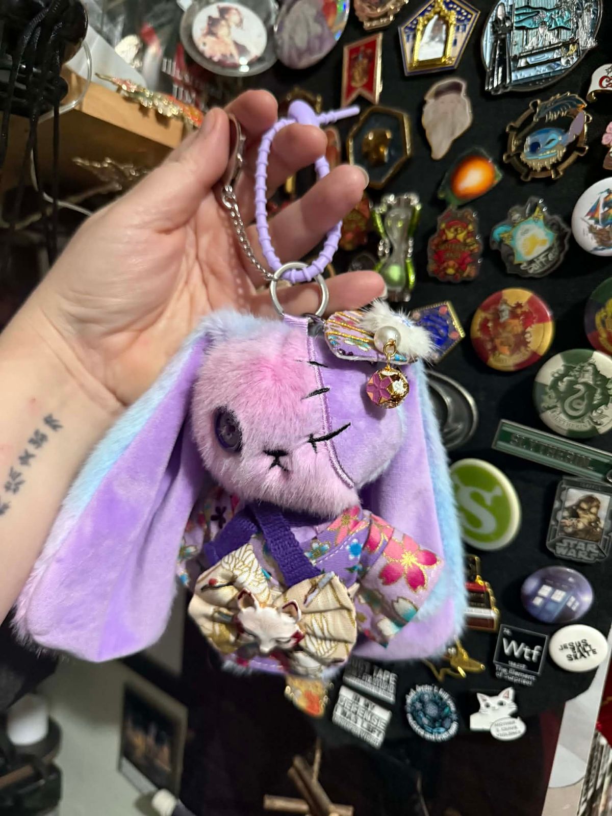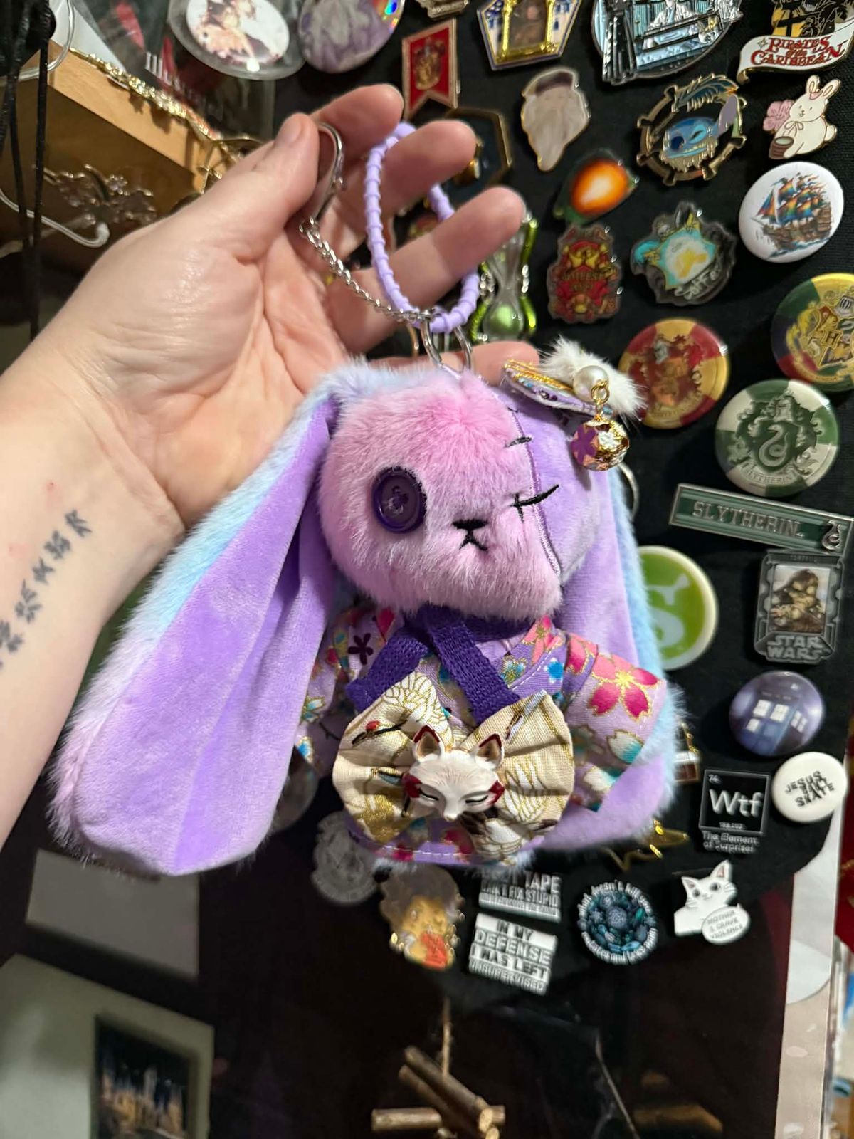 This little kimono is absolutely adorable and fits my bunny keychain perfectly. I love the detailing and the little fan hair clip is so cute. I will say thou my only critazum is that the belt could do with a small snap on the back of the robe to key it from falling off.
