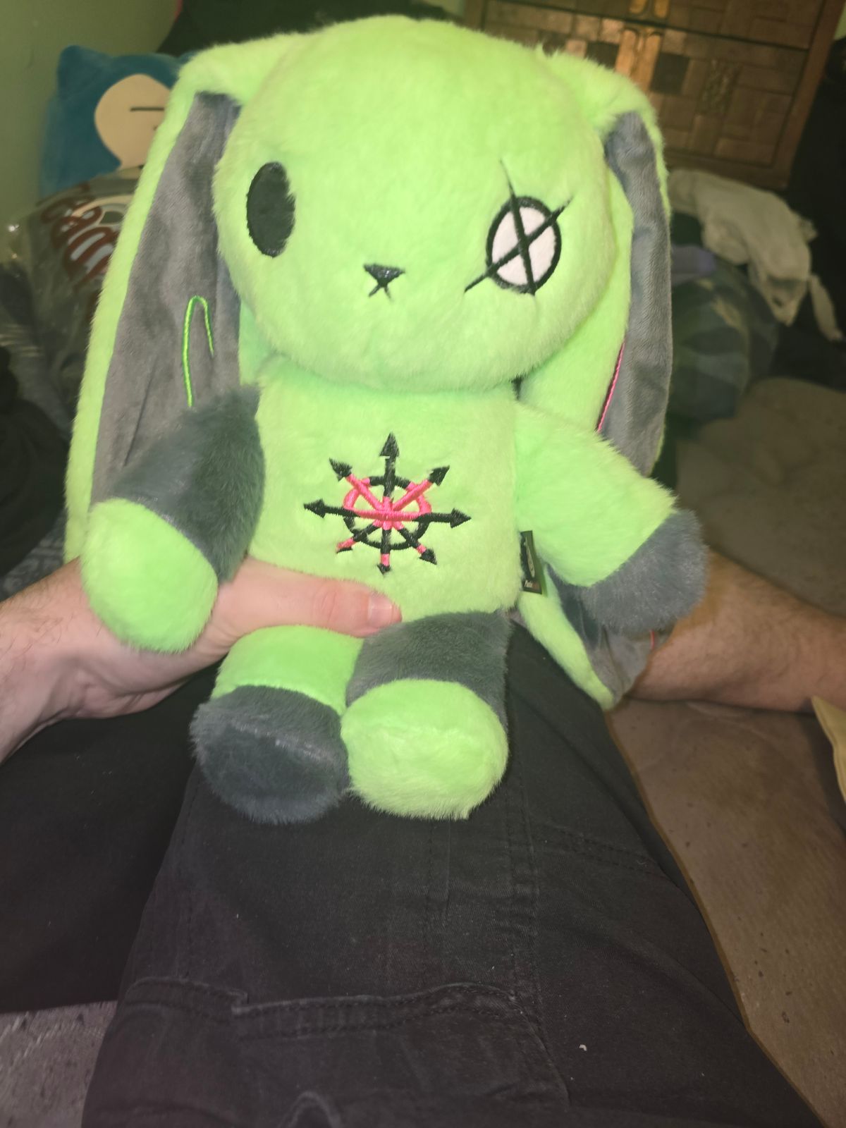 This radioactive green chaos gremlin is your plush spirit animal if your brain runs Windows 95 on 87 tabs at once. With mismatched limbs for the lost time warps and a stitched chaos sigil on its chest, this bunny isn’t broken - just tuned to a different frequency.