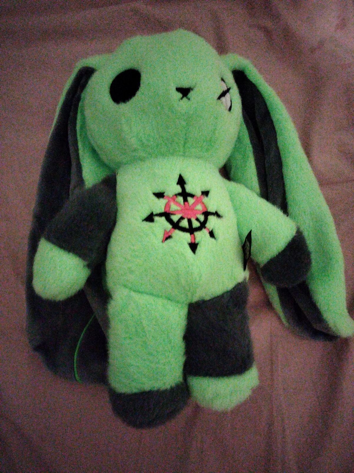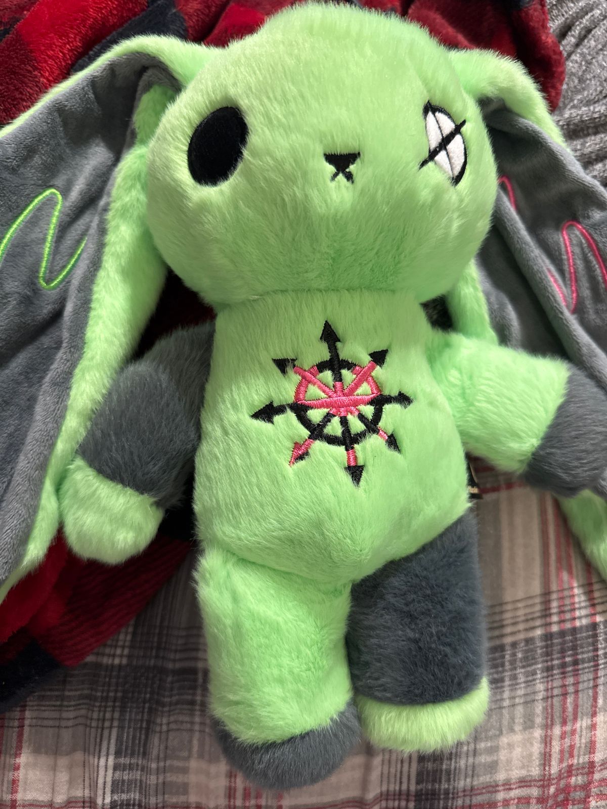 This radioactive green chaos gremlin is your plush spirit animal if your brain runs Windows 95 on 87 tabs at once. With mismatched limbs for the lost time warps and a stitched chaos sigil on its chest, this bunny isn’t broken - just tuned to a different frequency.