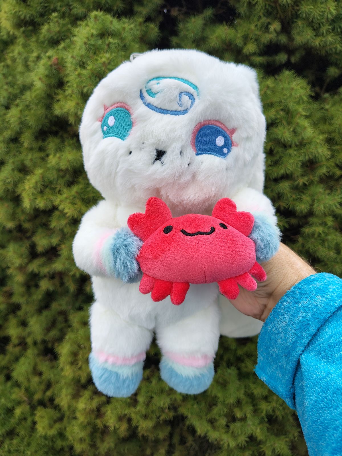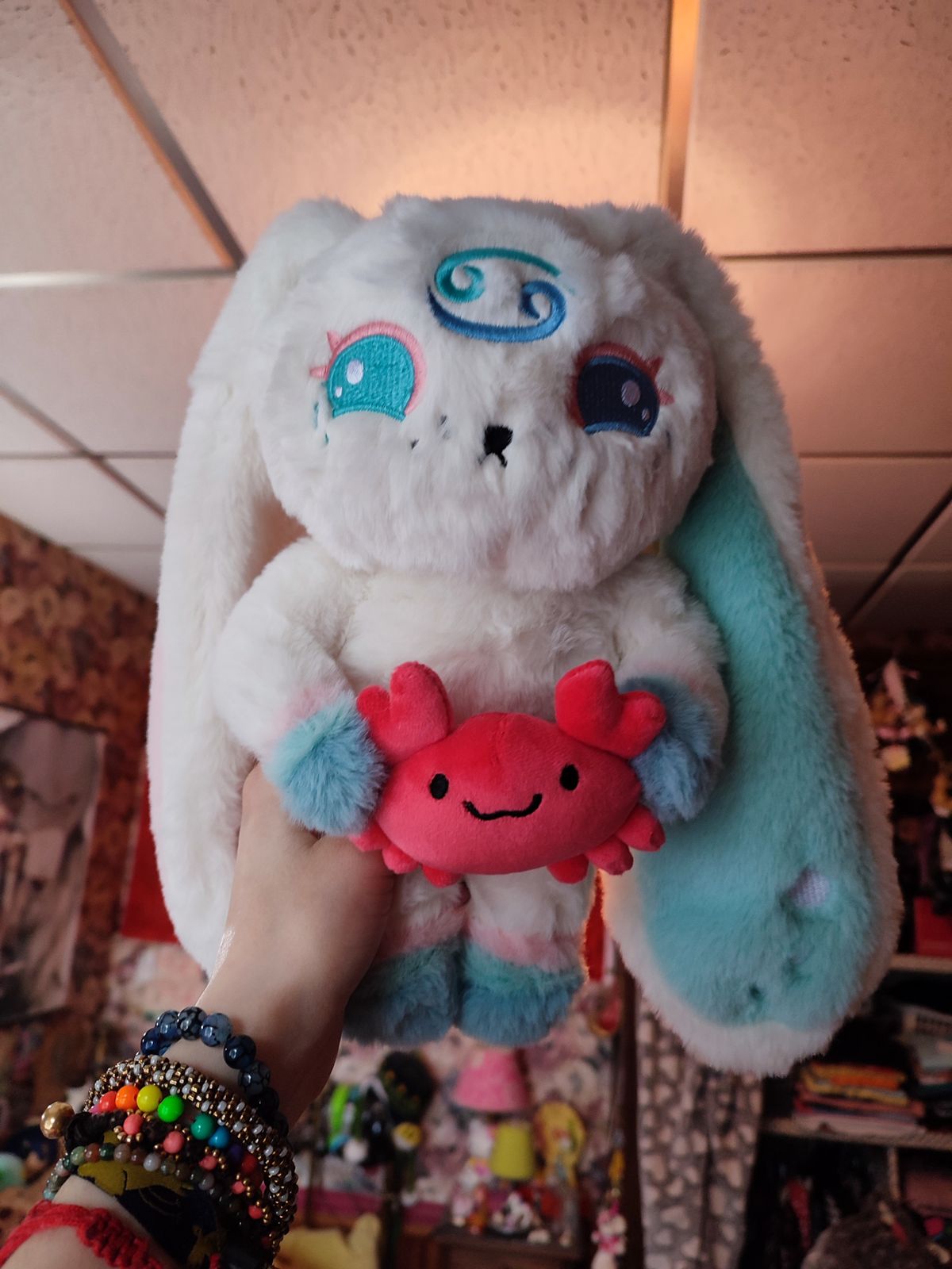 So adorable, so cuddle-able. Soft & sweet & really pretty - their eyes match the cancer zodiac ♋️ sign on the forehead - light blue + a more minty blue-green. Love that the bun is holding a crab since this is so symbolic for the cancer zodiac, too. Legs are shorter/stubbier than any of my other plushes & I appreciate the variety plus it adds to the cuteness factor.