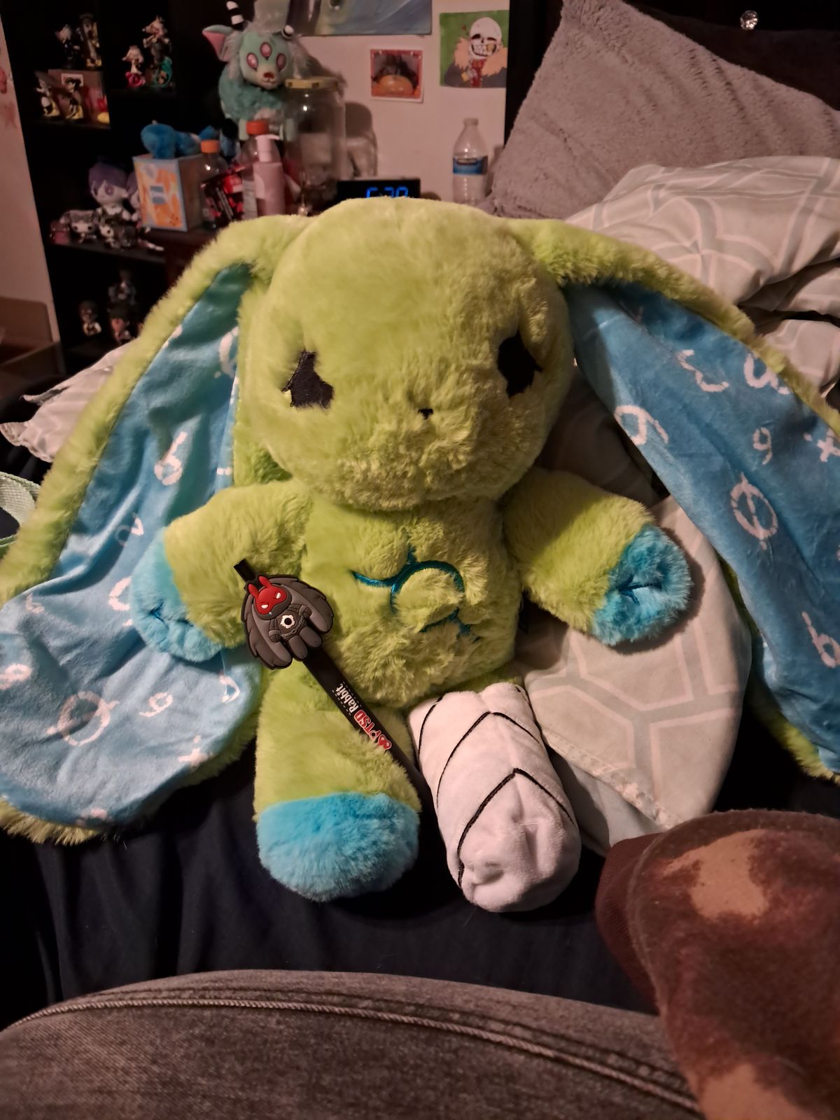 I've always wanted to buy a plushie dreadful so I'm happy to finally own one ^u^! I was happy to find there was a bun with dyscalculia since I have it and I feel like you don't see it talked about too often. The cutest little guy, his fur is sooo soft and I love his floppy ears. I just wanna pet him all day. I also love the colour scheme, green and blue is one of my favourite colour combos and it looks so good in person. It was like he was designed specifically for me /silly. The cast is easy to take off and put back on, it's a pretty snug fit so you won't have to worry about it sliding off. The tote bag is super cute too. Definitely worth it <3.