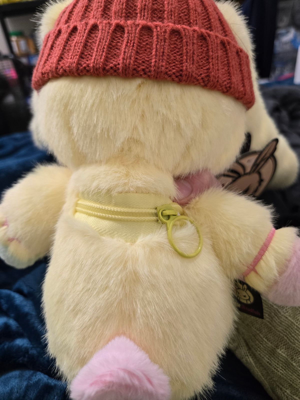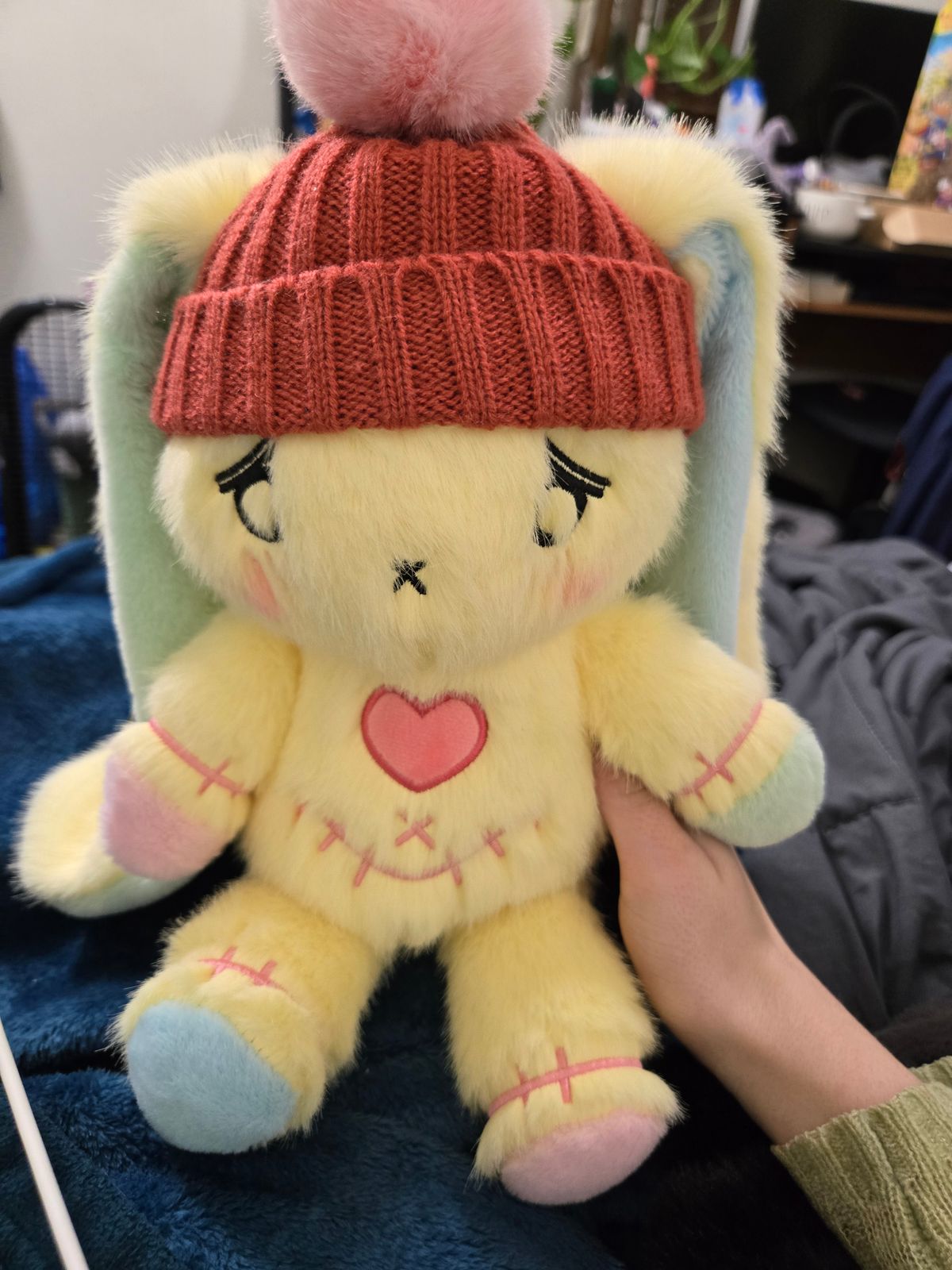 now for the meat of the actual product that needs to be reviewed: v2 is cute, but the updated design reflects a lot of more real parts of the condition. the slightly pained expression, temperature dysregulation color scheme on the paws, the little surgical scars on the abdomen…it isn’t as demure as v1 but it still feels comforting in a strange little way. it isn’t quite as chubby as v1 and can’t sit upright, but tbh that symbolically hits close to home. the fur has a different texture and feels really nice. the hat is a nice addition to the design and the quality of the knitwear is very good.