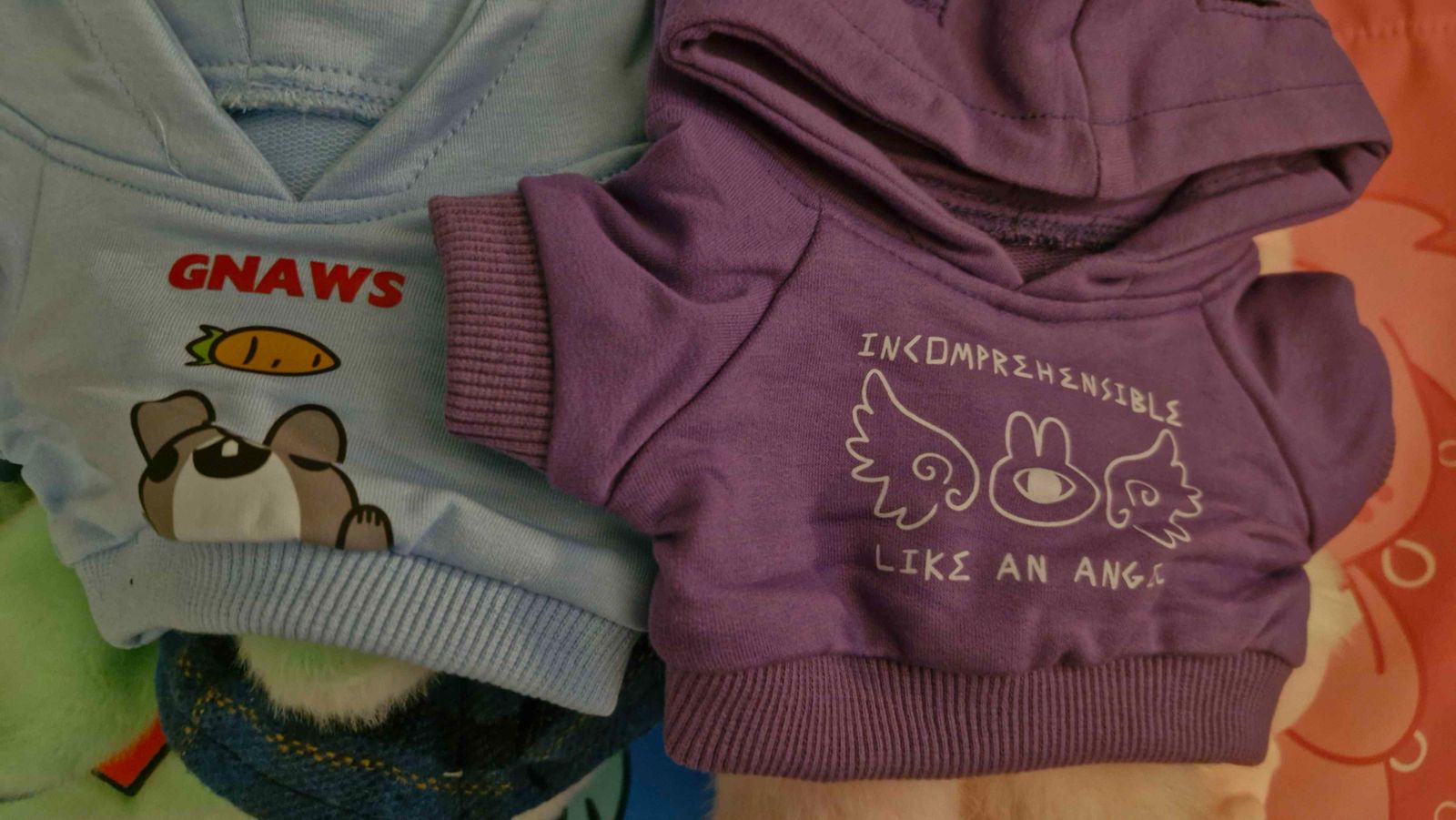 I love the hoodies the best out of all the clothes, but I'm ABSOLUTELY OBSESSED now that I can poke the buns' ears thru the hood and they can wear them all comfy cozy. Its so cutie.