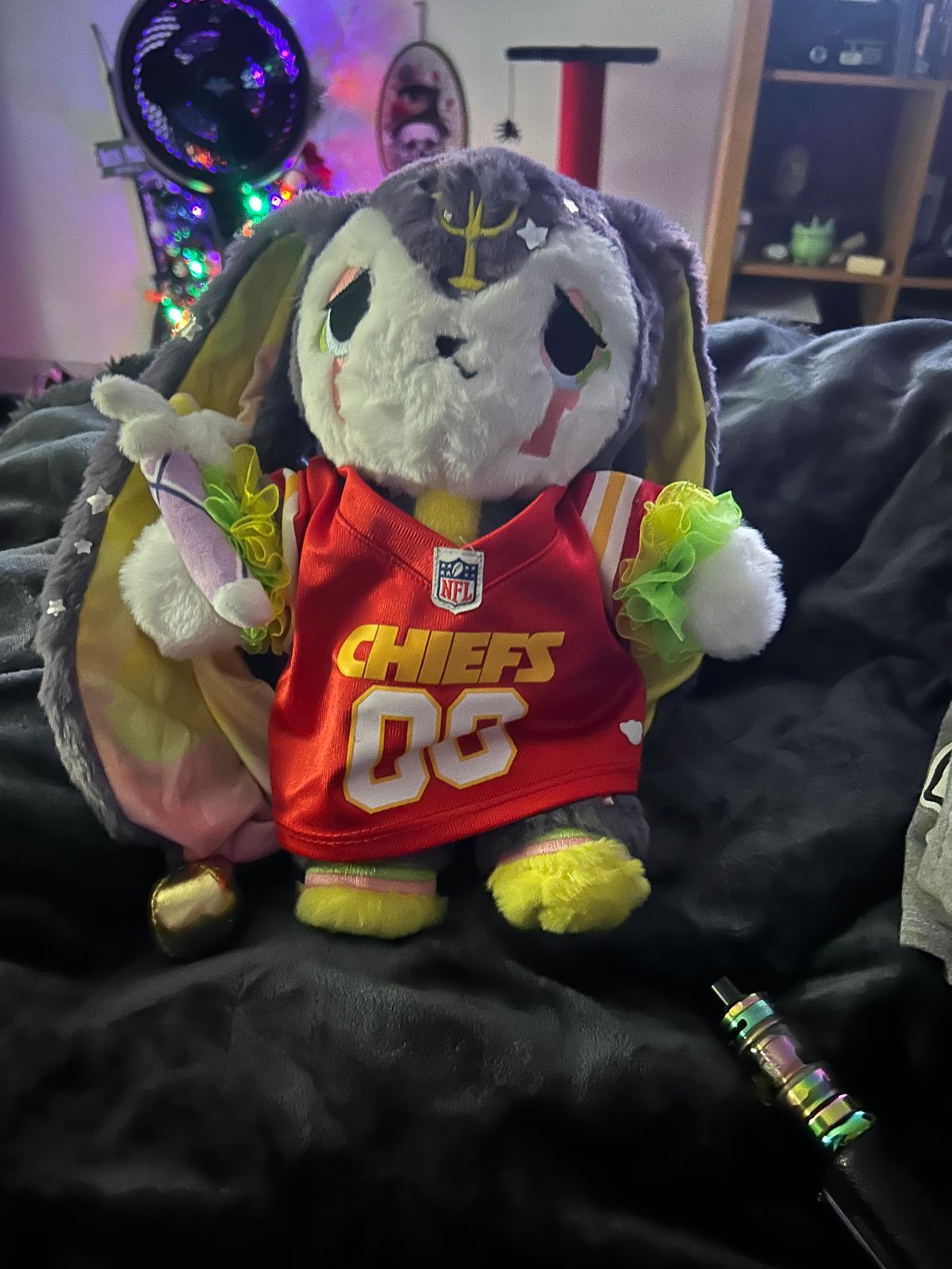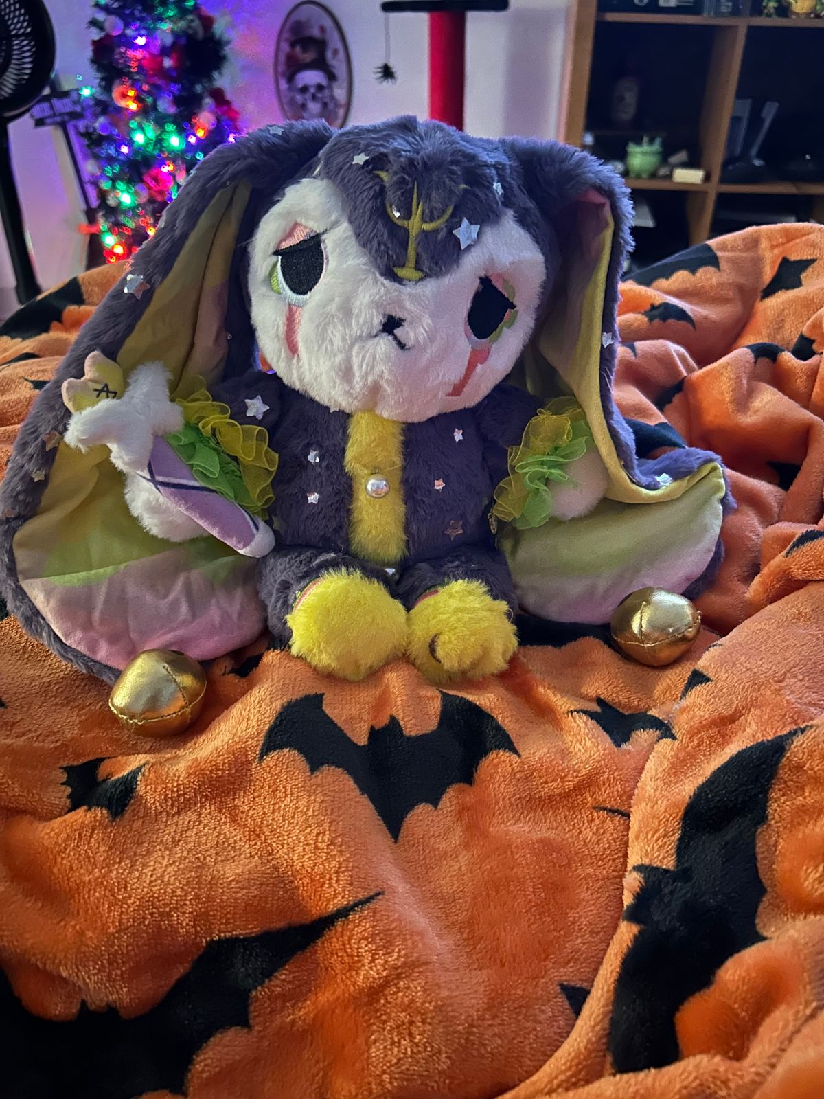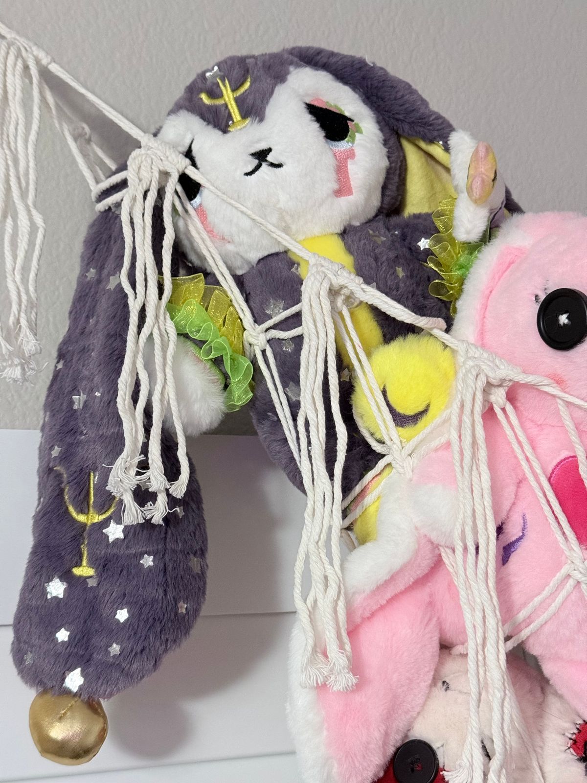 Lucid Dreaming Rabbit was one of my top-most anticipated new releases of this year, and this bun was without question the realization of a dream both literally and figuratively. The level of complexity and detail that this bunny boasts is absolutely second-to-none. Its fur is delightfully soft and features little foil stars that float along the surface of the fabric like shimmering reflections on still, dark water. For this reason, I tend to handle this bunny more gently so as to preclude the possibility of "fallen stars." The removable arm ruffles, the surrealistic inner ear design, and the highly intricate embroidery provide vibrant splashes of color that create a stunning counterpoint to the dark and neutral tones this bunny sports. Even the removable wand is packed with details, adding the perfect finishing touch of magic. You couldn't possibly hope to find a better companion to guide you through the astral plane, or to hold onto in your waking hours.