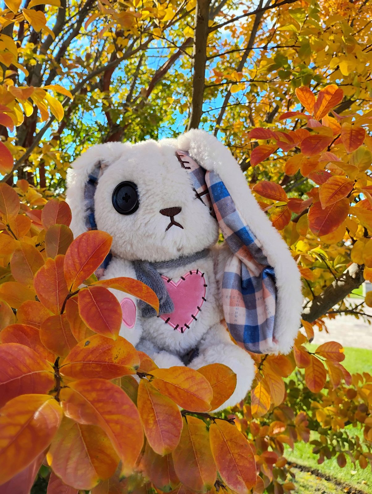 This bunny holds a certain ineffable quality that is quite unlike any of my other Plushie Dreadful rabbits. Her soft, wooly fabric elicits feelings of comfort and nostalgia in equal measure, and her muted colors echo the faded beauty of the final days of autumn. She exudes the warmth of a crackling fireside at sunset, and the sweetness of a mug of freshly pressed apple cider. Her presence is a reminder of days of innocence and peace, and I strongly recommend that you open your heart and your home to this special bunny.