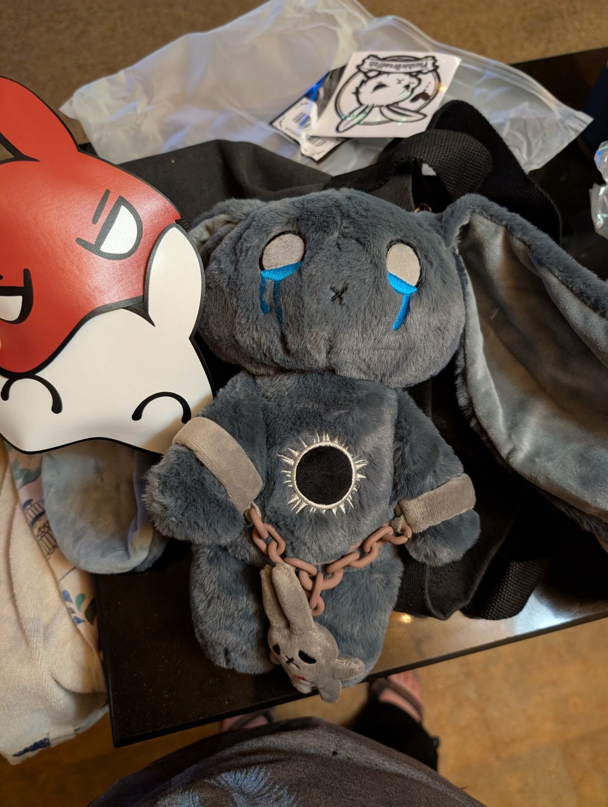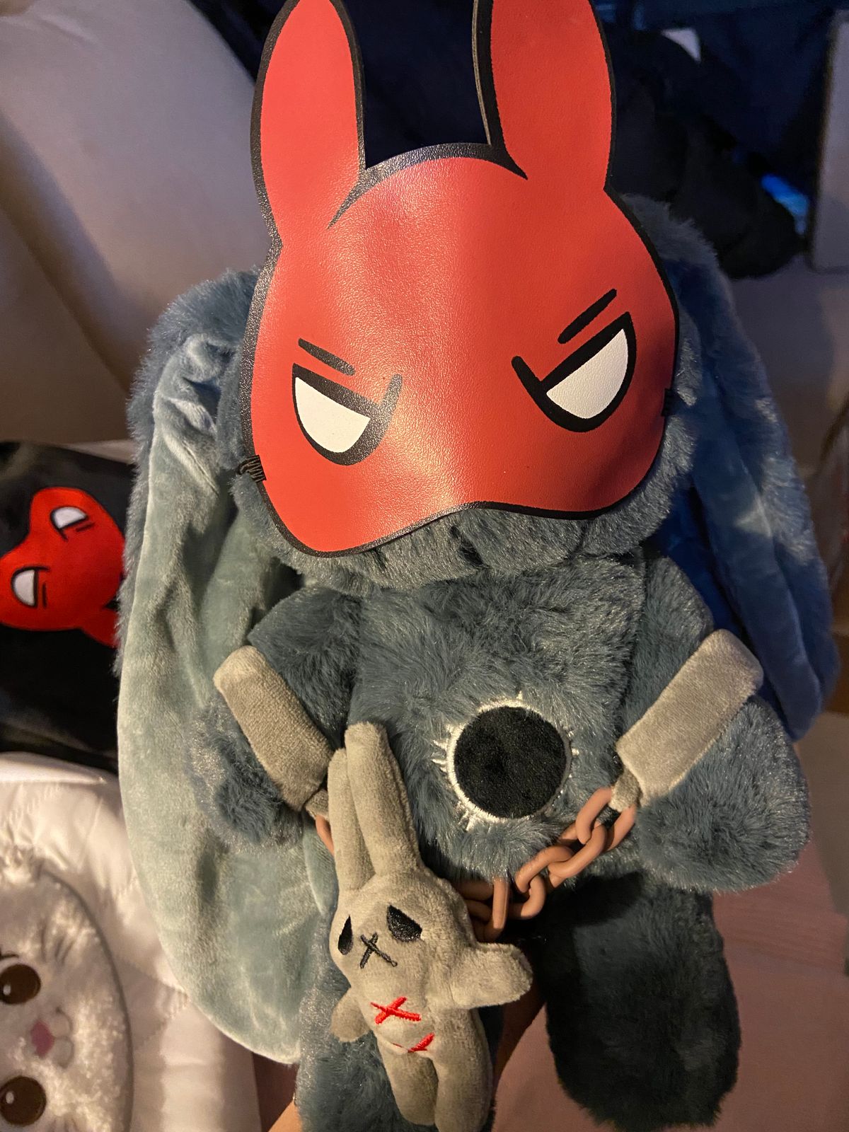I have complex PTSD due to childhood trauma and verbal, mental and emotional abuse. I was struggling with my diagnosis and wether what I had endured was real. I have never felt herd or understood until I found you guys. I call him PT. When PT arrived everything became real, I wasn’t crazy or making things up. I really went through those things. He is such an excellent representation of how it feels hiding behind masks of fake happiness and anger when you feel broken inside. The chains represent so well the powerlessness I feel always controlled by what happened to me. Unable to escape. I also love the black sun on his chest it makes me think of the darkness of the pain and brokenness that keeps the real me from shining through. I also anxiety bunny and plan on buying BPD and depression bunny. Thank you so much for what you do. You make people feel seen and heard.