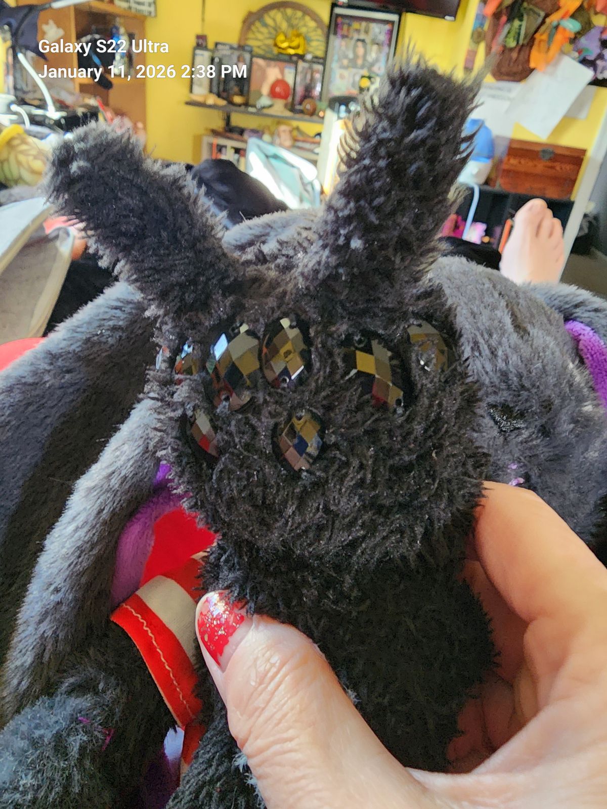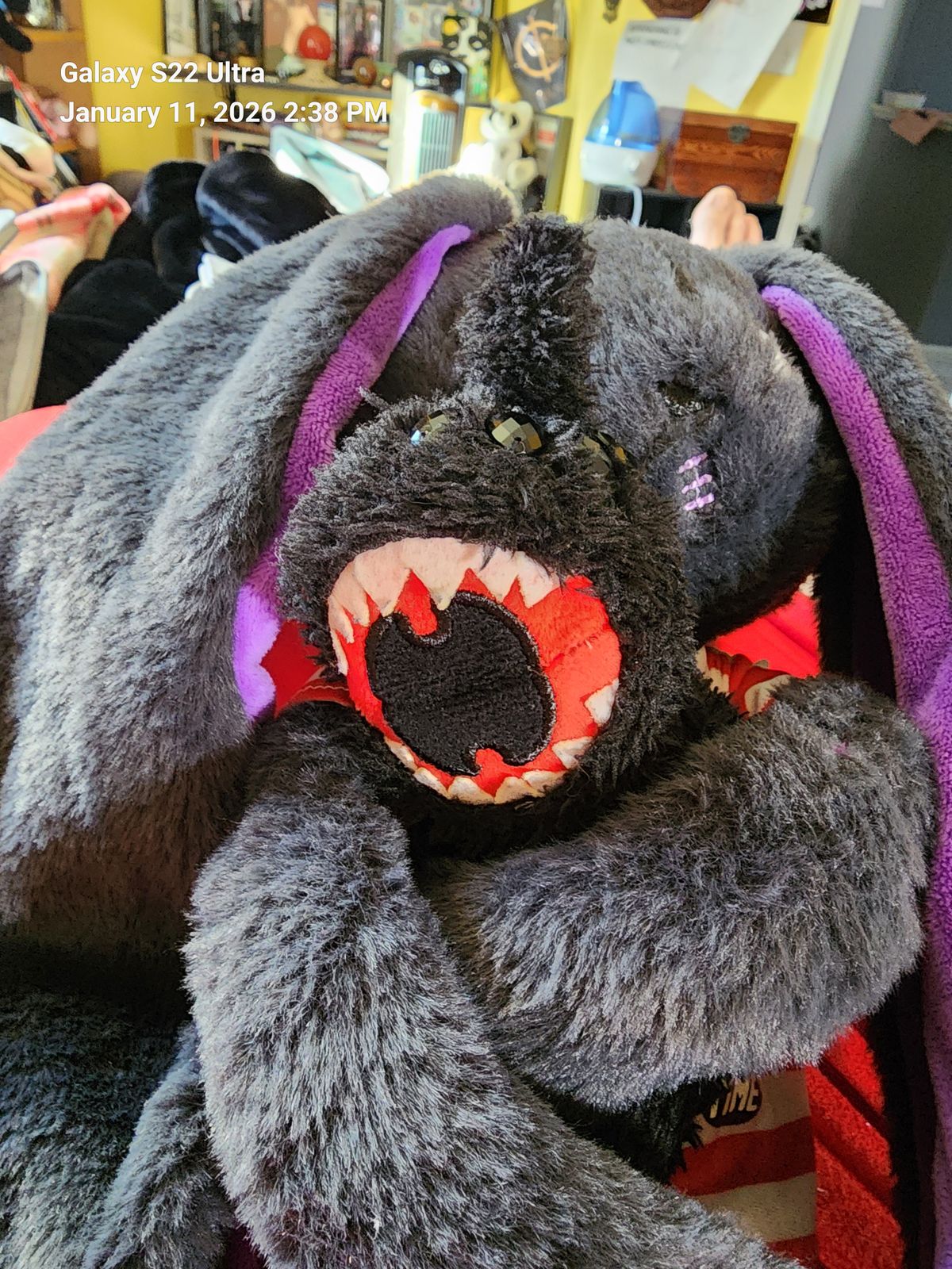- The teeth of the little stuffed animal that accompanies the rabbit are damaged.