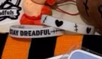 One band is printed with the signature “STAY DREADFUL” motto and plush stitch details, while the other features a stitched accent and a bold little heart that glows with attitude.