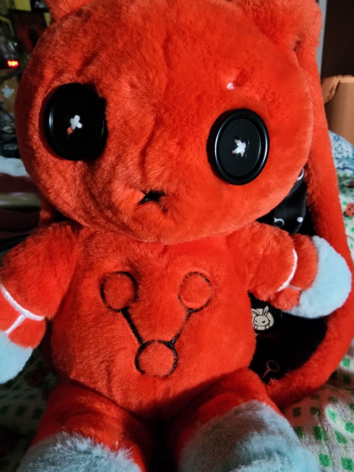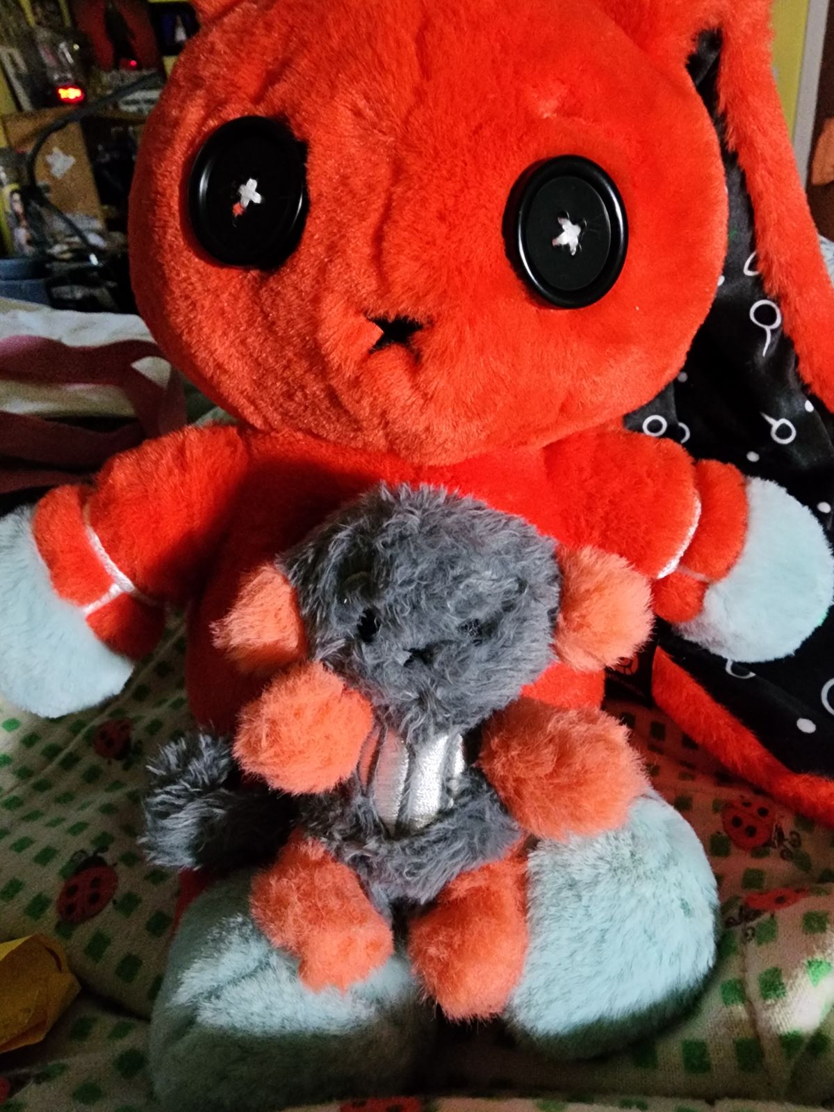 I’m literally sooo pleased with him, he’s so soft and the details on him are amazing, I adore his little button eyes and his sweet long ears, what a cutie pie! He’s my new favorite plushie! My mom died in March last year from something to do with addiction, I obviously wanna keep it private, but this guy means the world to me! It’s like I get to hug her again! Thank you! Thank you! Thank you! ❤️❤️❤️❤️❤️ I like to think the monkey is the anxiety part of so you can take them out when you wanna, like you feel less anxious. I don’t have a name for the monkey yet, but the bunny is Walter, cause I thought the name meaning was sweet. It means the commander of the army 🥹