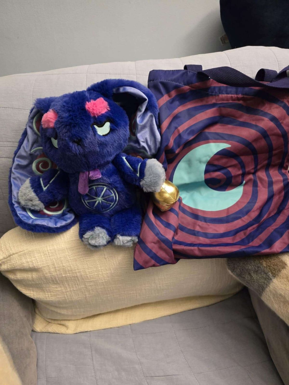 This bunny's design was one of the most visually arresting and dizzyingly delightful of this year's new releases, but as appealing as his online photos are, he is even better in person! This bun has a nice solid feel which gives me a sense of groundedness and stability, but it's the sumptuously soft fabric and the playful floppy limbs makes Vertigo rabbit a true sensory delight. The swirling whirlpools on his inner ears have an almost hypnotic effect, and his tufty hot pink eyebrows add a colorful splash of whimsy. The additional bell accessory is absolutely darling, and I really appreciate the fact that it can be easily removed to give a little reprieve from the noise (something which this bun will surely thank you for as well!) I really enjoy his unique eye expression as well, as it sets him apart from the rest of the buns and very effectively conveys that sense of vertiginous turbulence. Vertigo bunny makes a great companion for those days when it feels as though your world is being turned upside down or you're being tossed about in the capricious flux of life, and I highly recommend this plushie to anyone who can identify with these feelings.