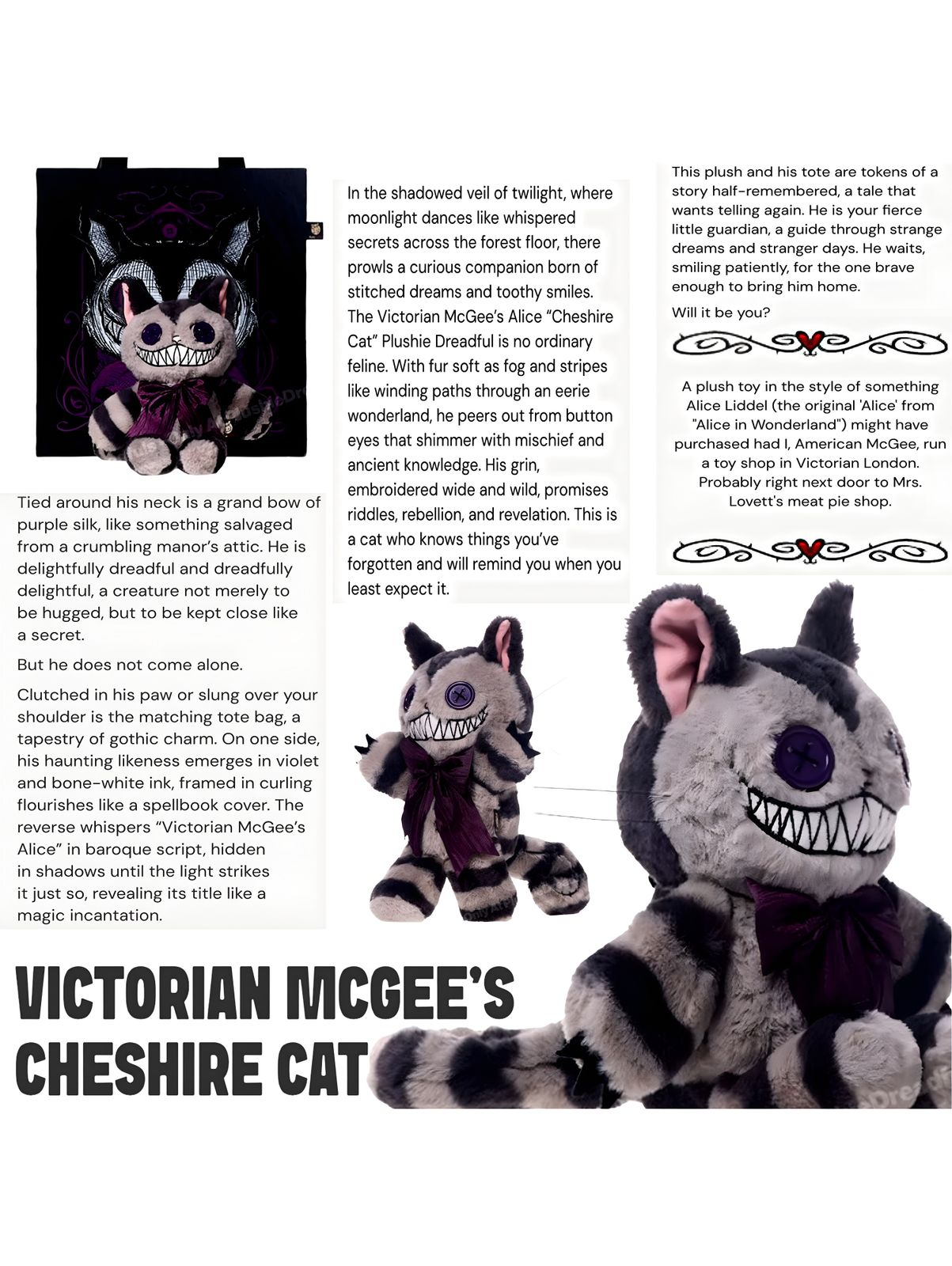 Clutched in his paw or slung over your shoulder is the matching tote bag, a tapestry of gothic charm. On one side, his haunting likeness emerges in violet and bone-white ink, framed in curling flourishes like a spellbook cover. The reverse whispers “Victorian McGee’s Alice” in baroque script, hidden in shadows until the light strikes it just so, revealing its title like a magic incantation.