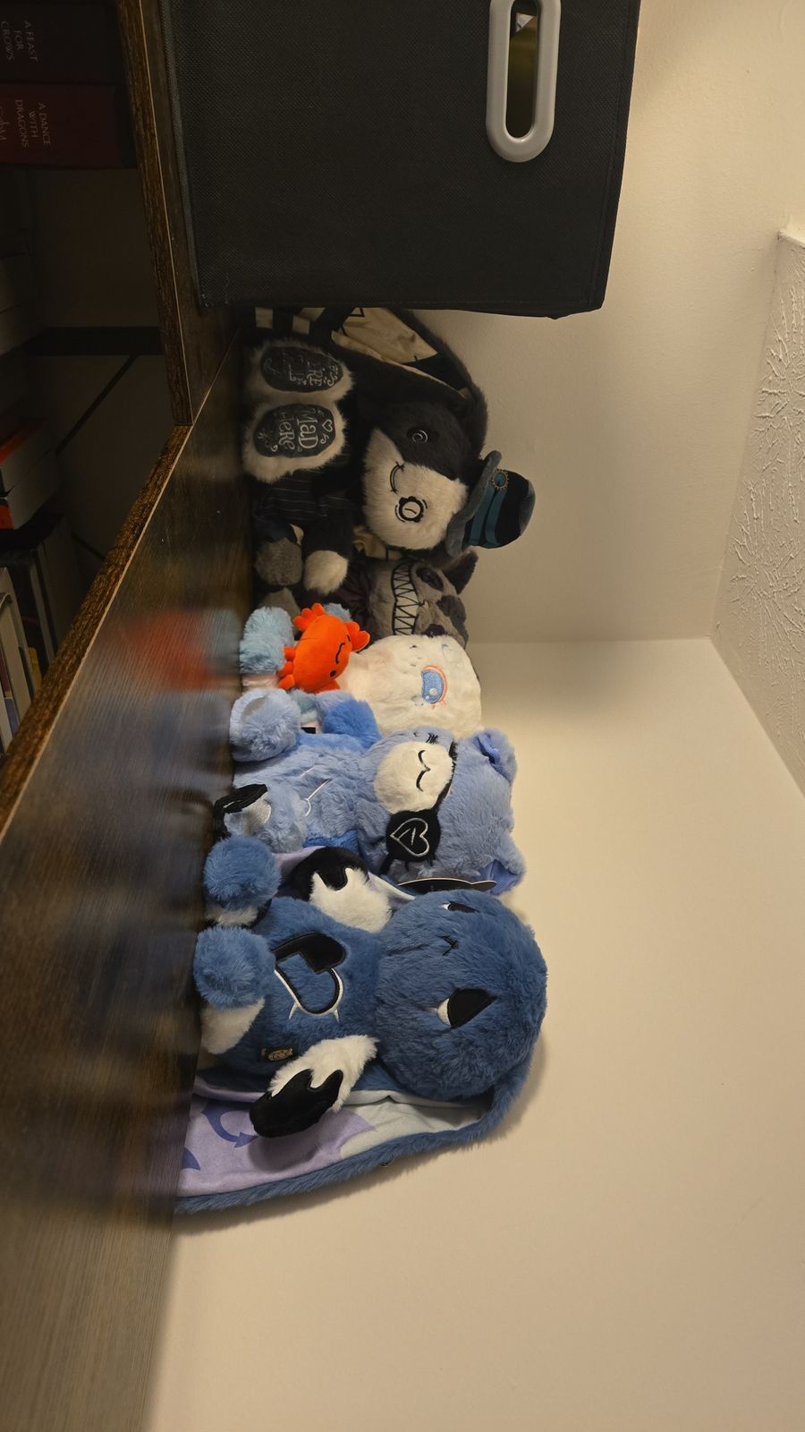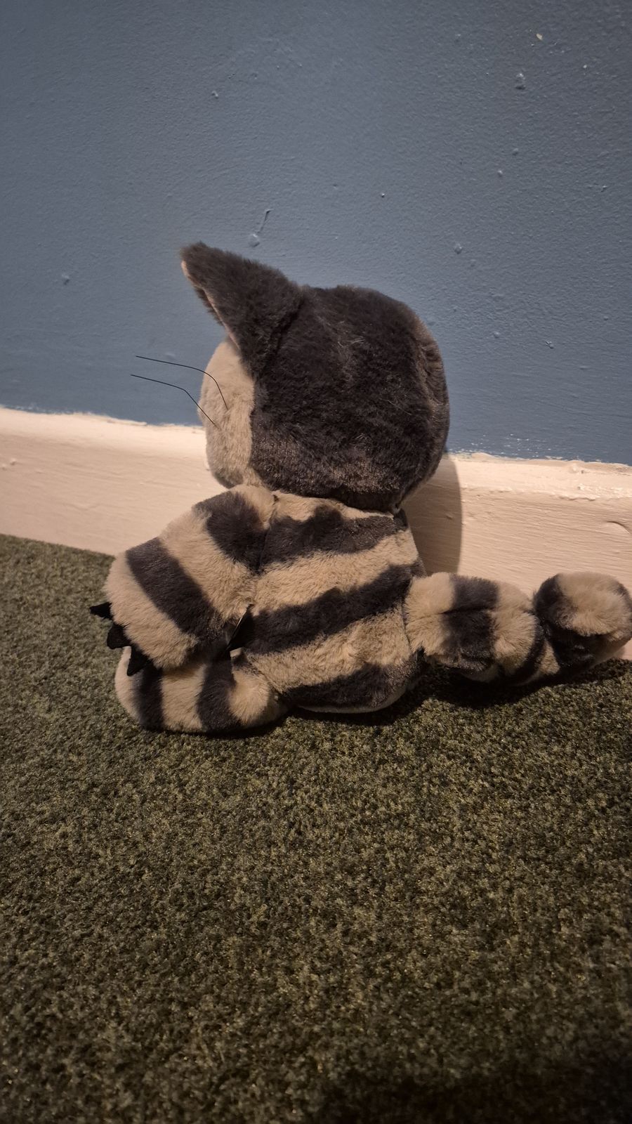 Tied around his neck is a grand bow of purple silk, like something salvaged from a crumbling manor’s attic. He is delightfully dreadful and dreadfully delightful, a creature not merely to be hugged, but to be kept close like a secret.