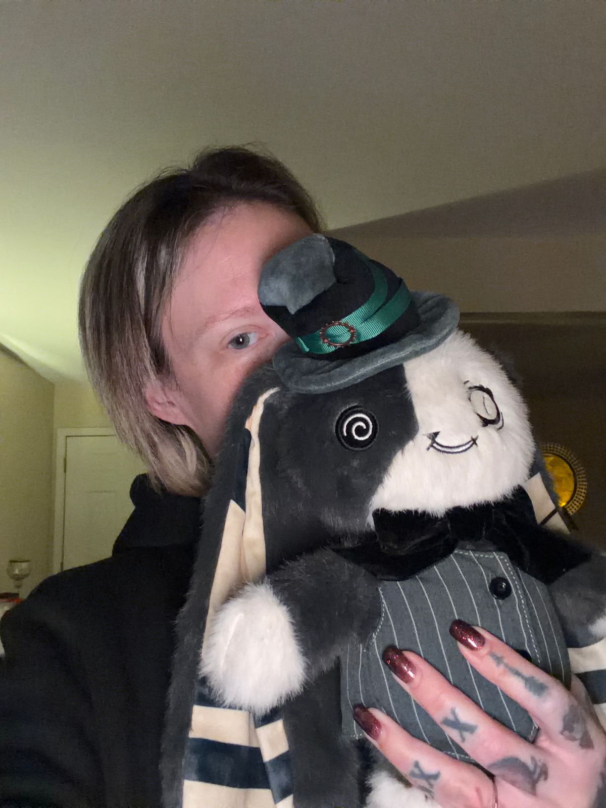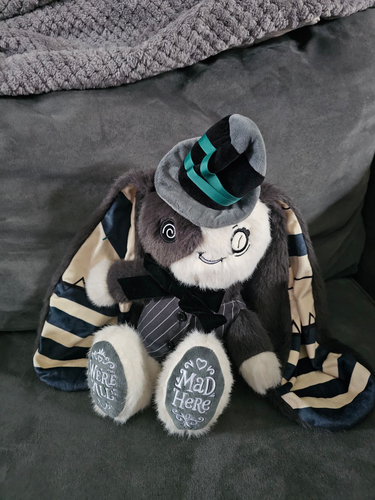 Look inside his long, striped ears and you’ll find the tea party in full swing. No need to RSVP. He is already saving you a seat. His fuzzy feet are embroidered with the truth you’ve always suspected. “We’re All Mad Here.” Not a threat. Not a diagnosis. A celebration.